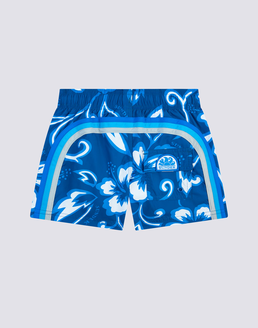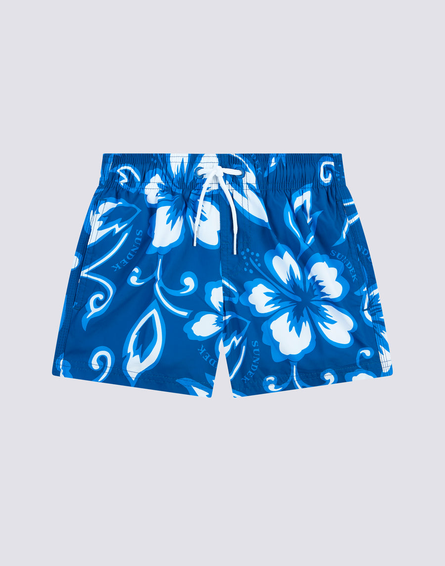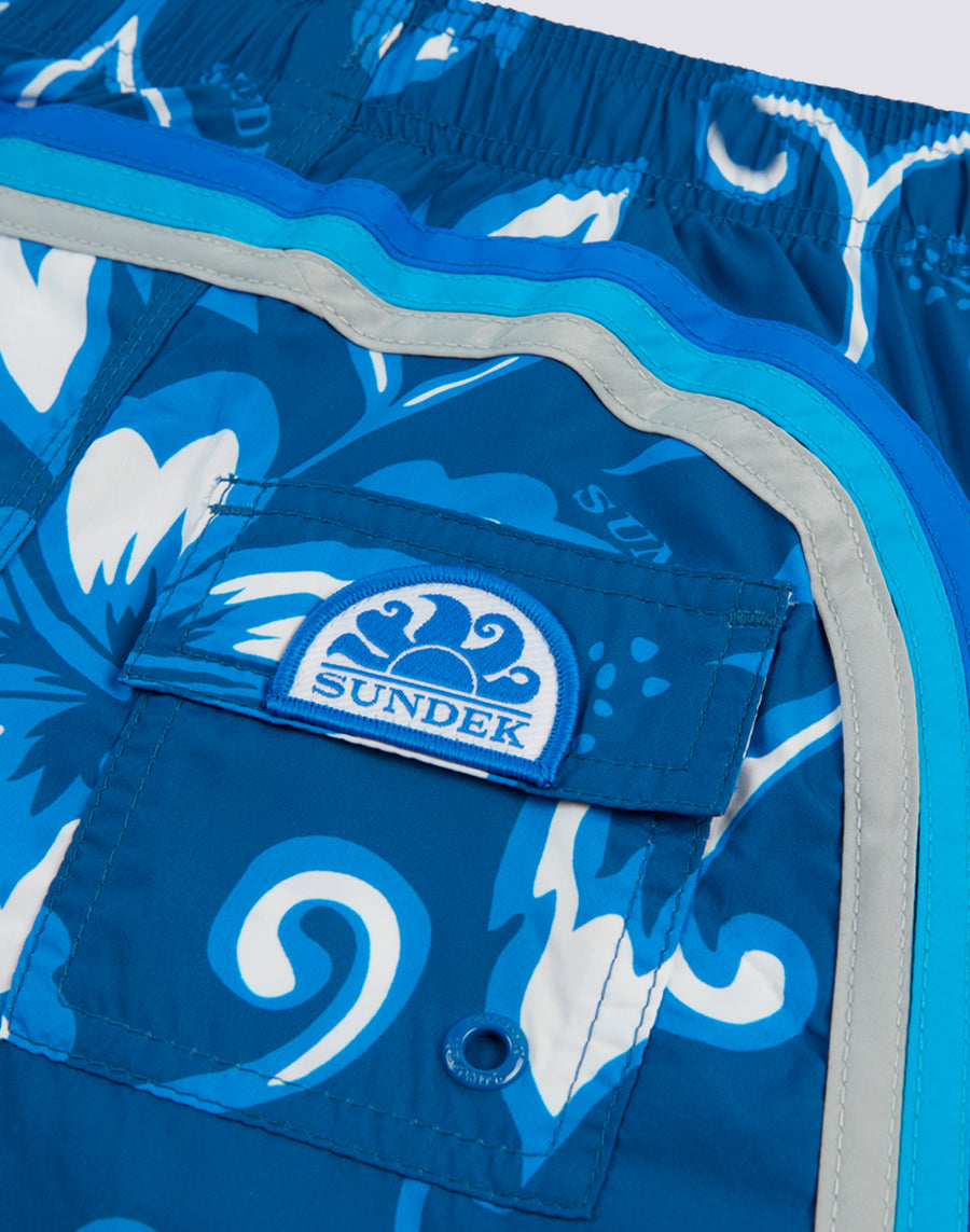Swimshorts with elasticated drawstring waist, in lightweight Repreve® fabric recycled from plastic bottles. Iconic SK23 print and the traditional Sundek rainbow on the back. Outer thigh width 10.25"/26 cm (size 6 years). Also matches briefs in the same pattern!