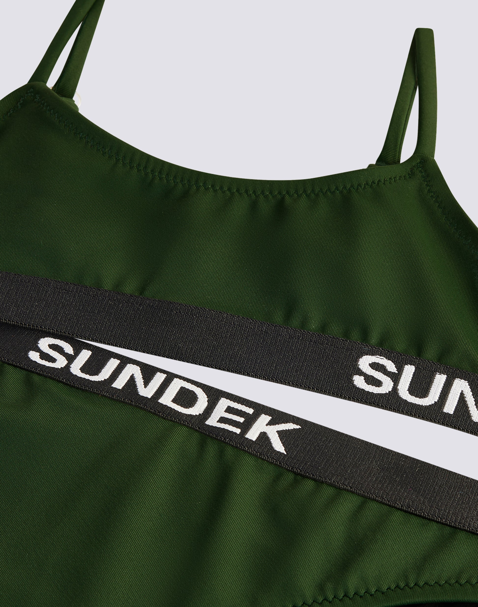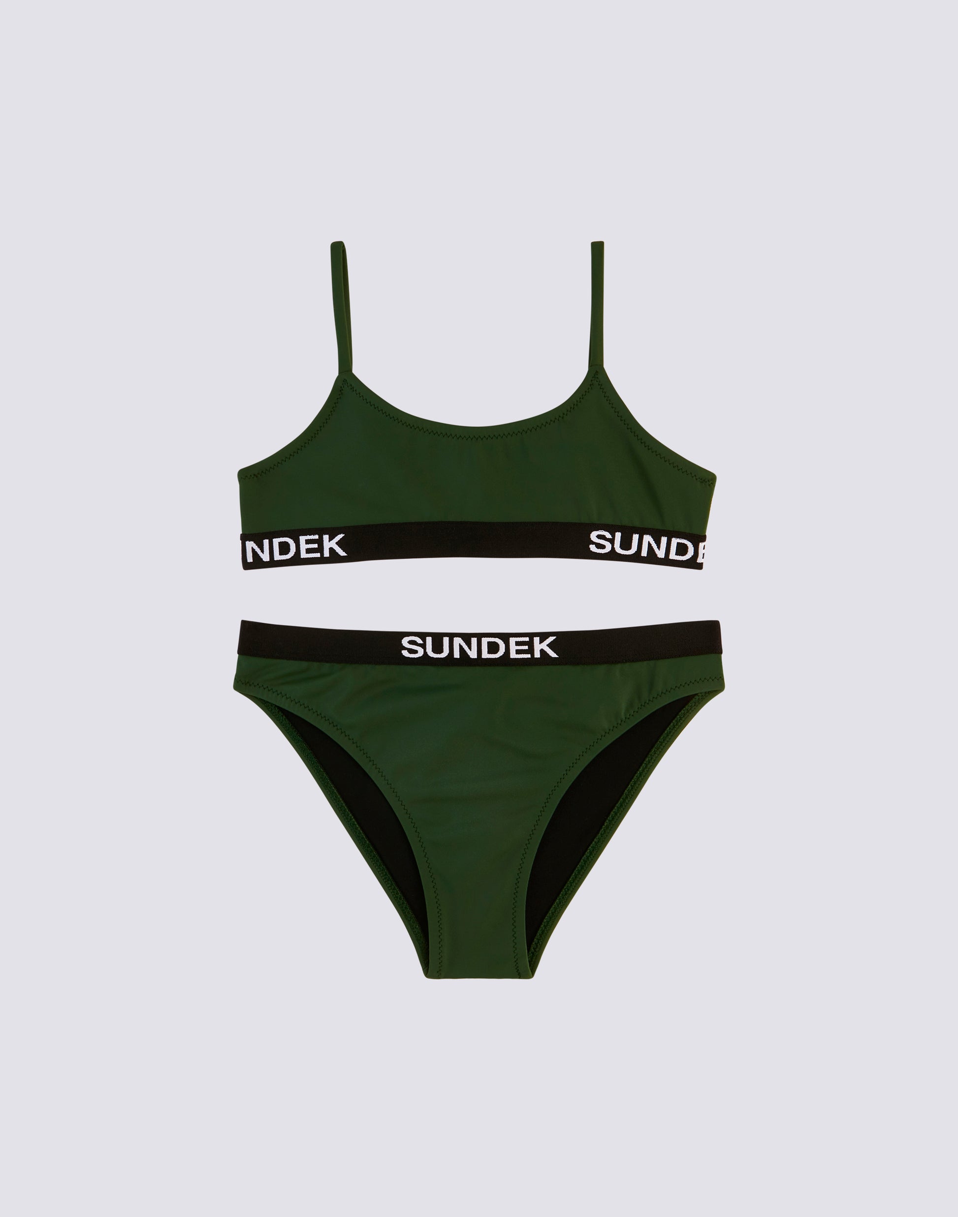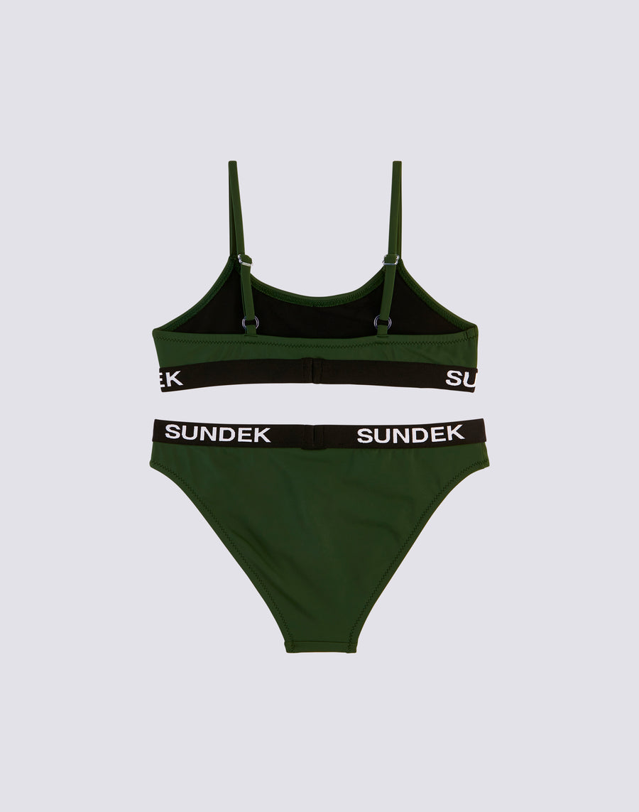 Made up of a bandeau top and briefs with an elasticated waistband, this girls' bikini is finished with a contrasting logo. The sustainable, soft and strong fabric is ready for a thousand swims and games on the beach.