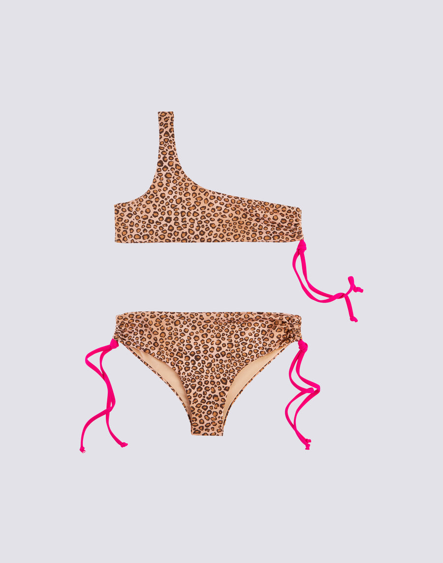 A trendy look for little fashionistas: the one-shoulder bikini with leopard print and adjustable contrasting laces offers comfort and style. The top can be worn with a single strap or with an uncovered shoulder for various styles, while the laces allow for a perfect fit. Enjoy fun in the sun with your little girl!