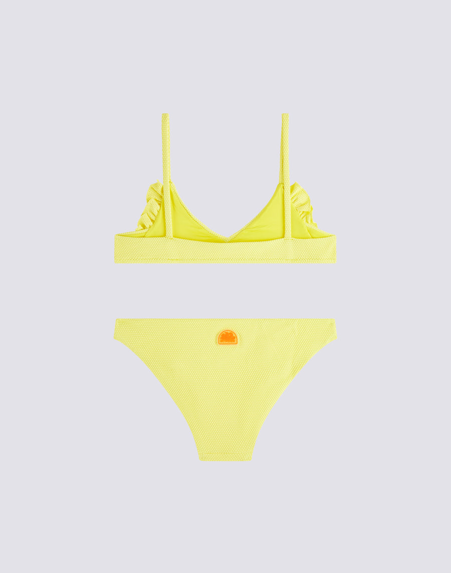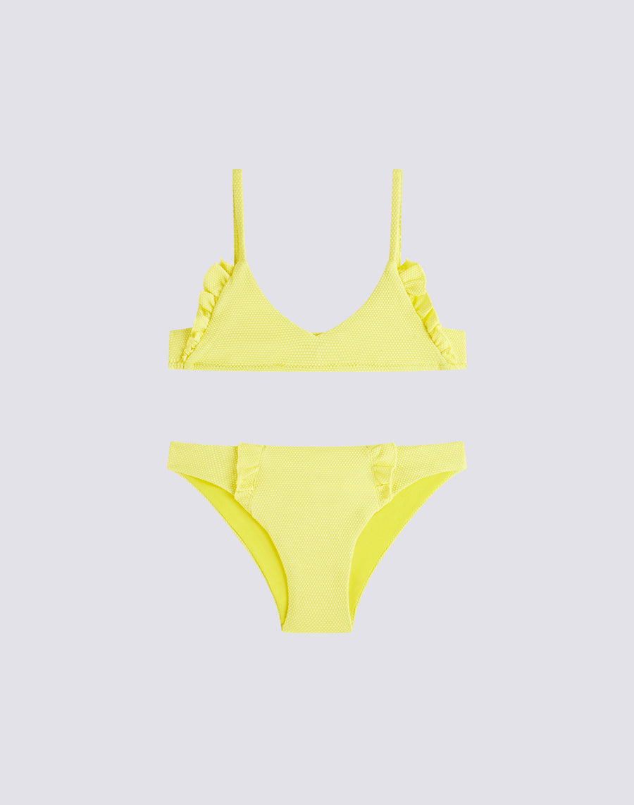 Girls' bikini made up of top and bottoms, both characterized by ruffles. The straps of the top are adjustable, while the bottoms have a fixed waist.