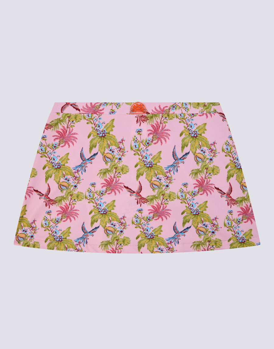 Mini sarong skirt for girls with Sweet Parrot print, elasticated waist and slit opening at the front.