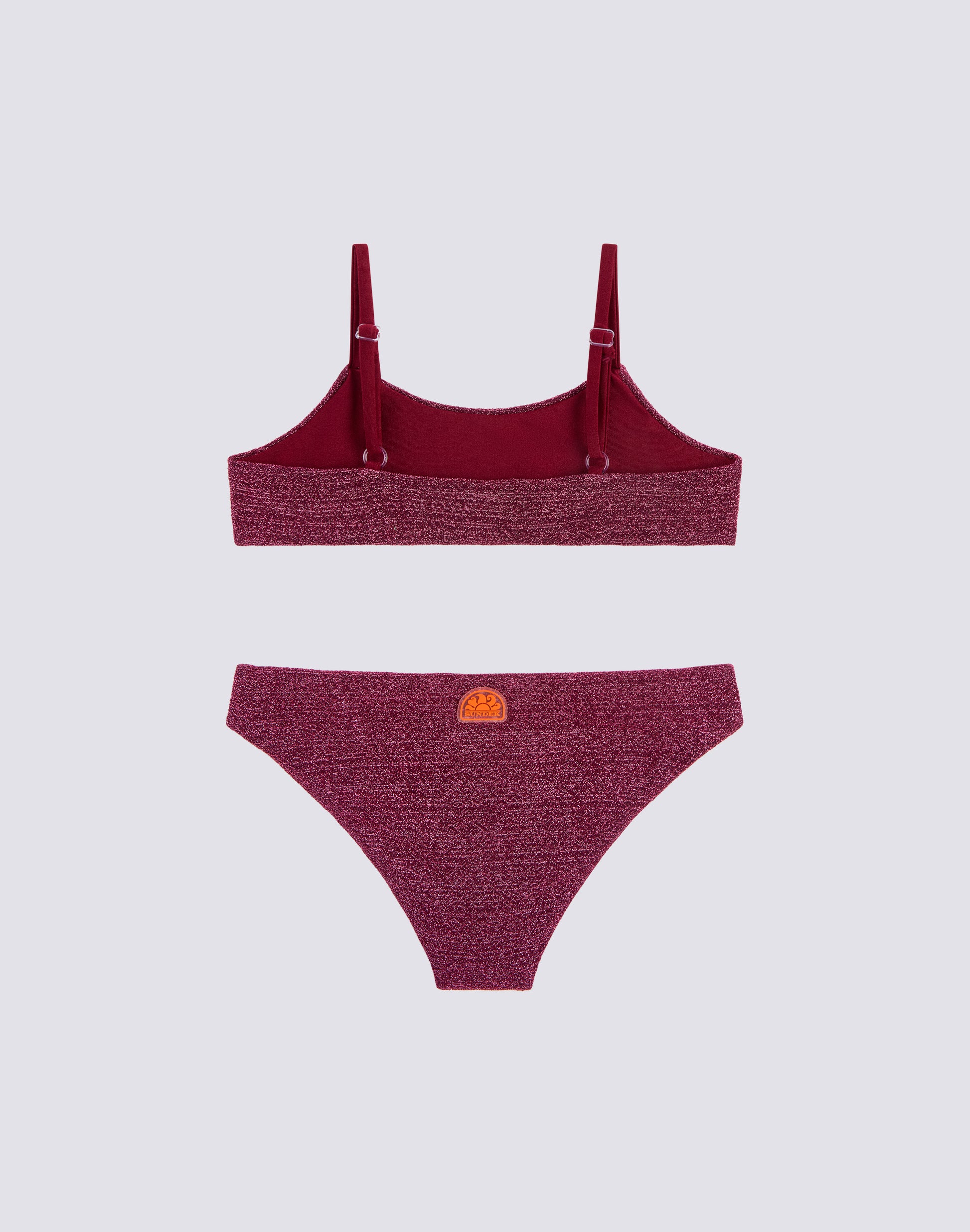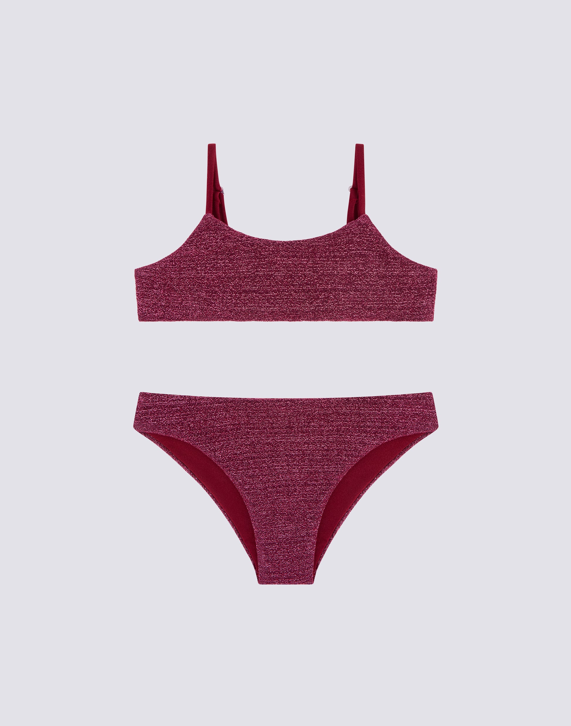 To shine under the sun, choose the girls' bikini in lurex. Young girls won't want to miss out on this beachwear ensemble with a bandeau top and a bright and comfortable lurex bottom.