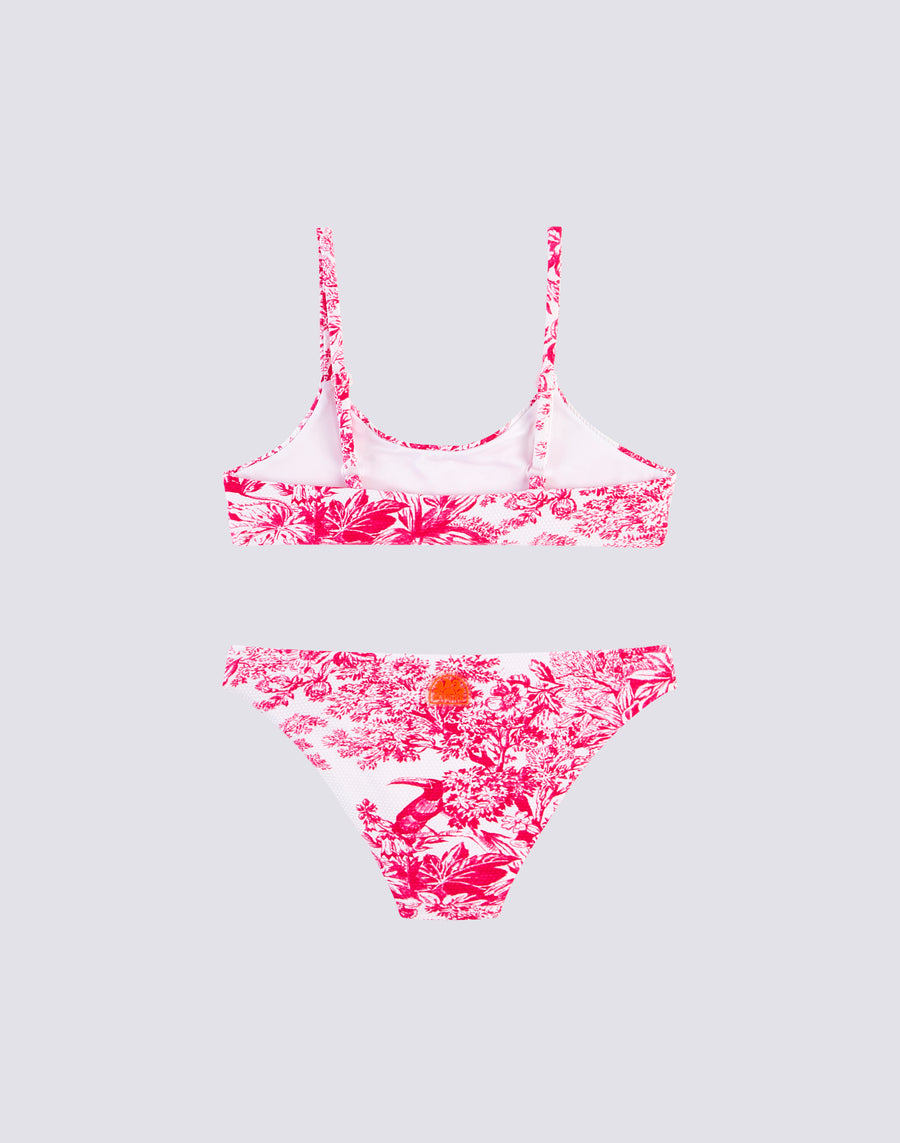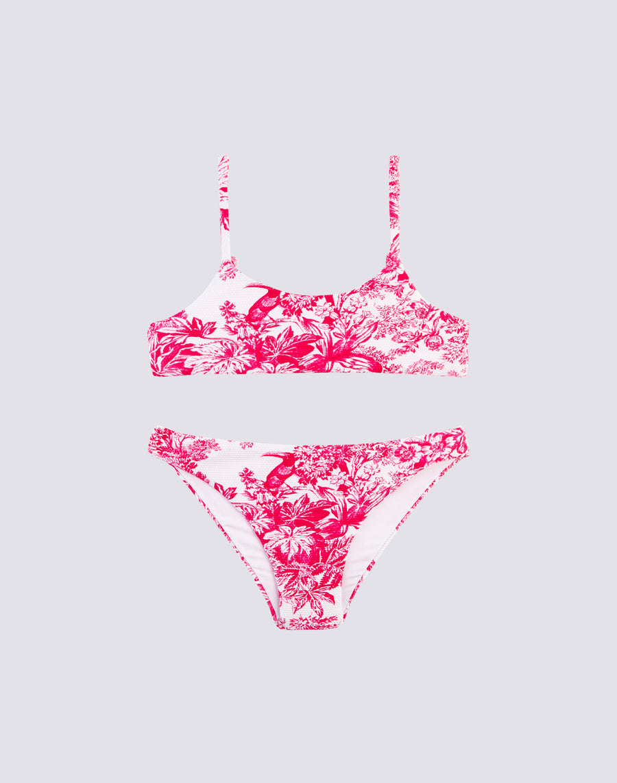 Romantic girl's bikini with Toile de Jouy pattern, consisting of top and bottoms. To be worn in coordination with the mother's model .