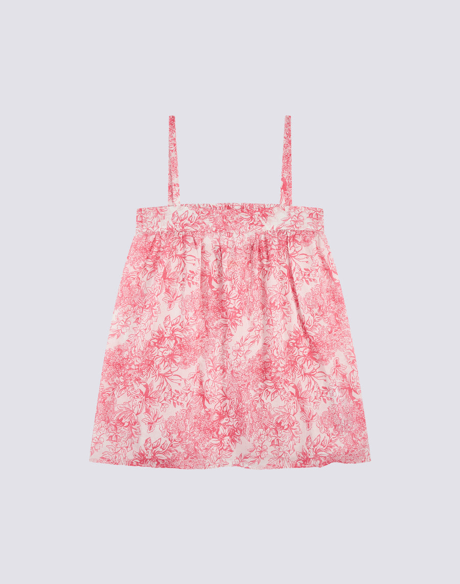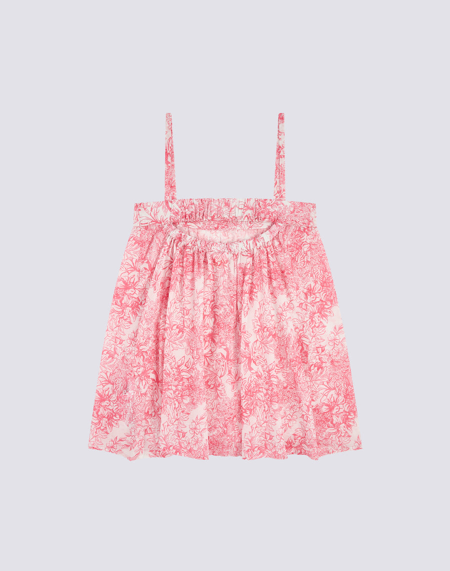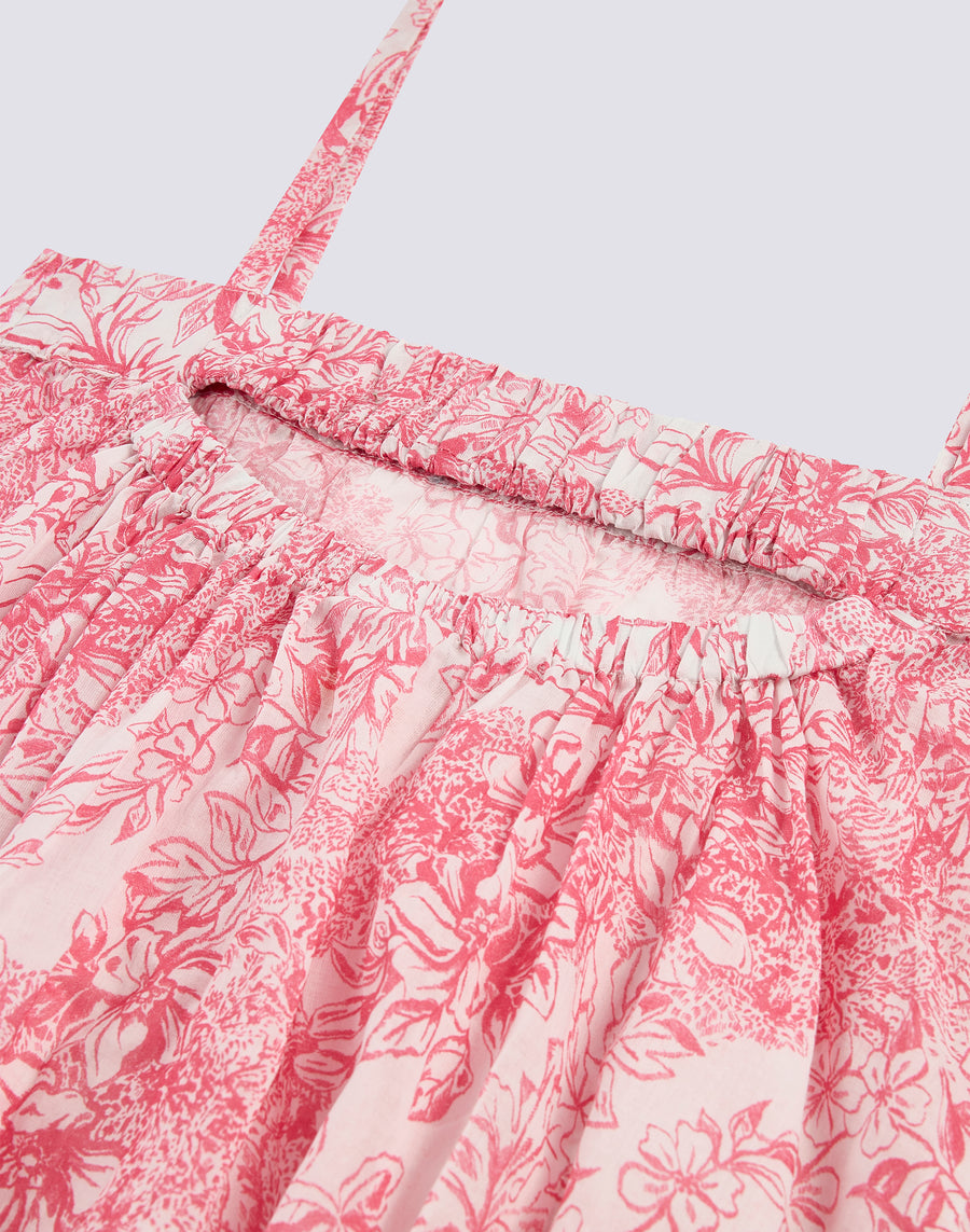 Sleeveless short dress for girls with an elegant Fleur de Joie print. With elasticated, gathered shoulder straps and a tie at the back, it is the ideal garment to wear for special occasions.