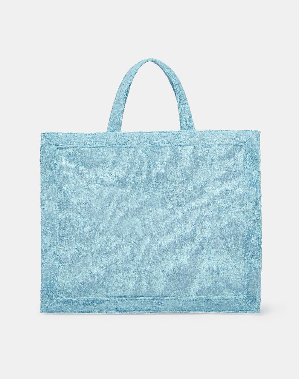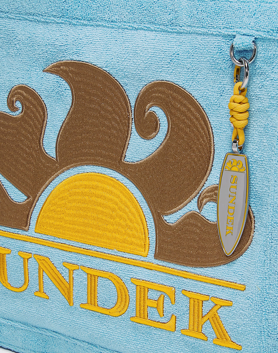 Towelling beach bag with an embroidered logo. Iconic surfboard charm
