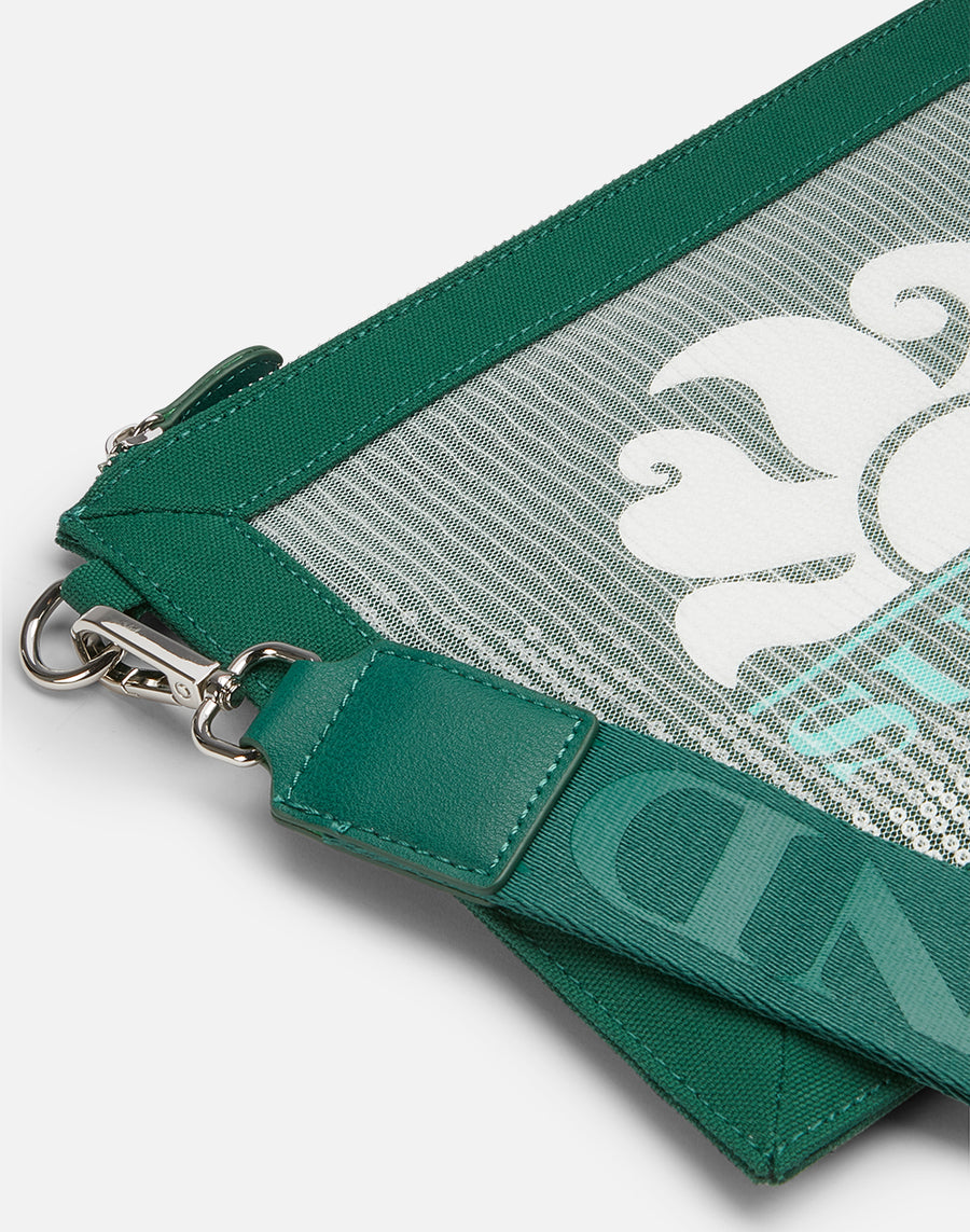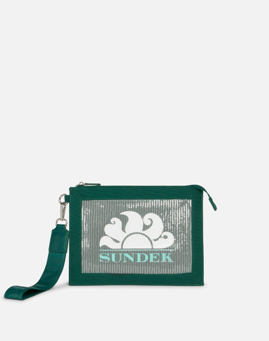 Sequinned mesh clutch bag with an embroidered Sundek logo. Perfect as a toiletry bag or a clutch bag. Detachable strap with the Sundek logo. Size: 27 x 20.5cm