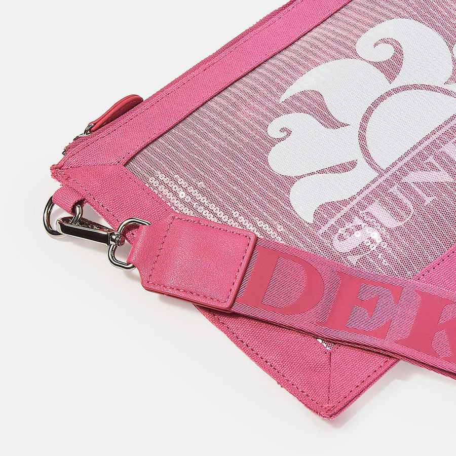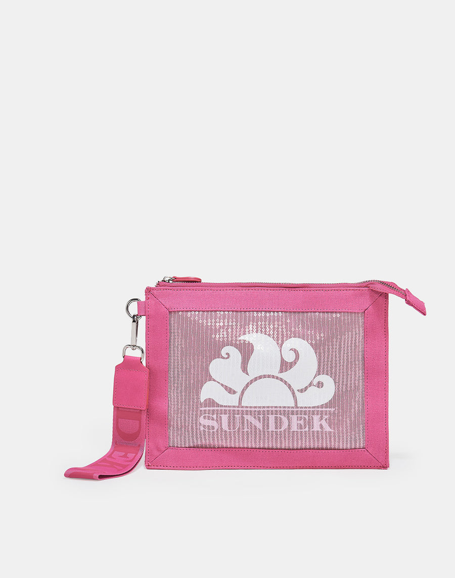 Sequinned mesh clutch bag with an embroidered Sundek logo. Perfect as a toiletry bag or a clutch bag. Detachable strap with the Sundek logo