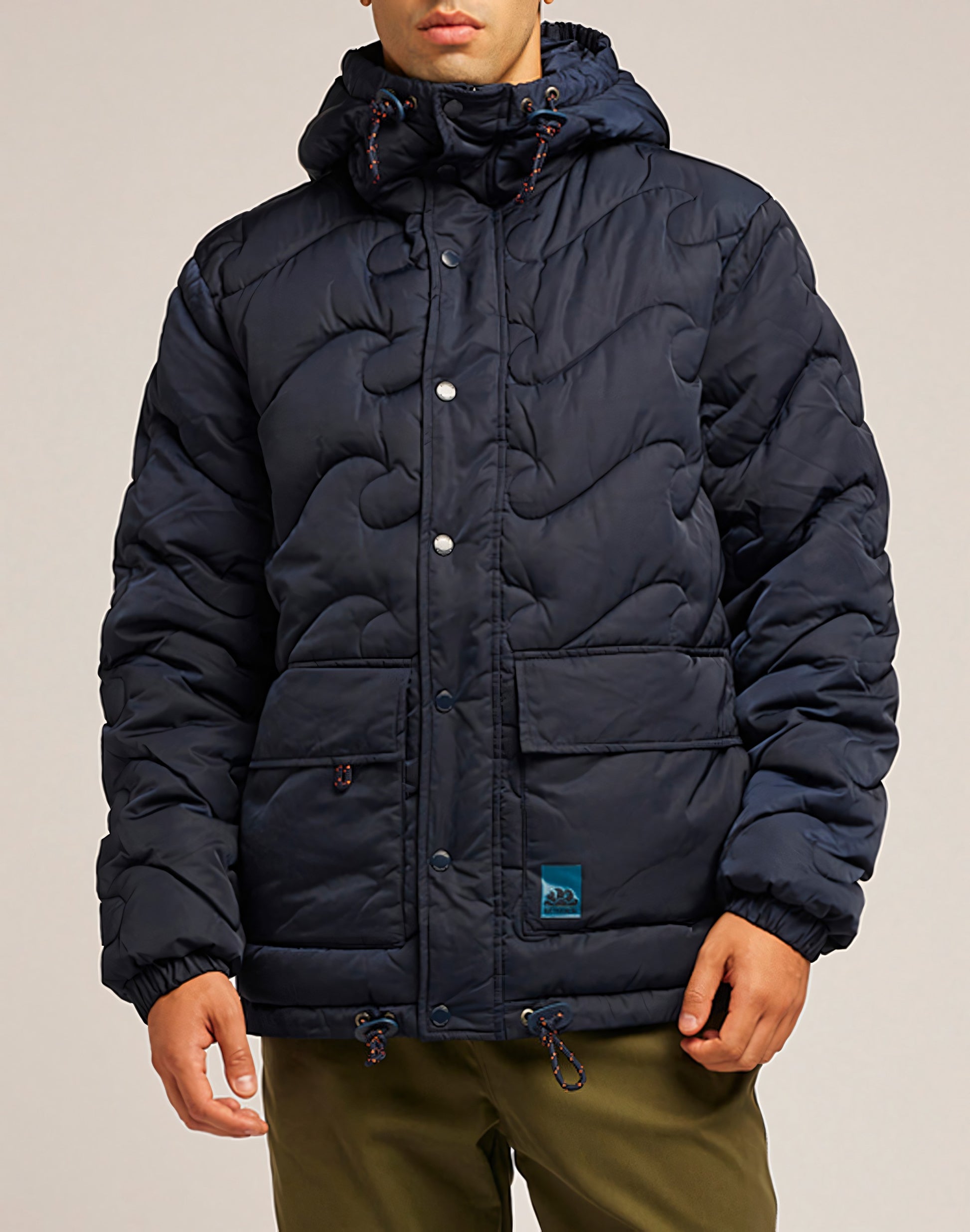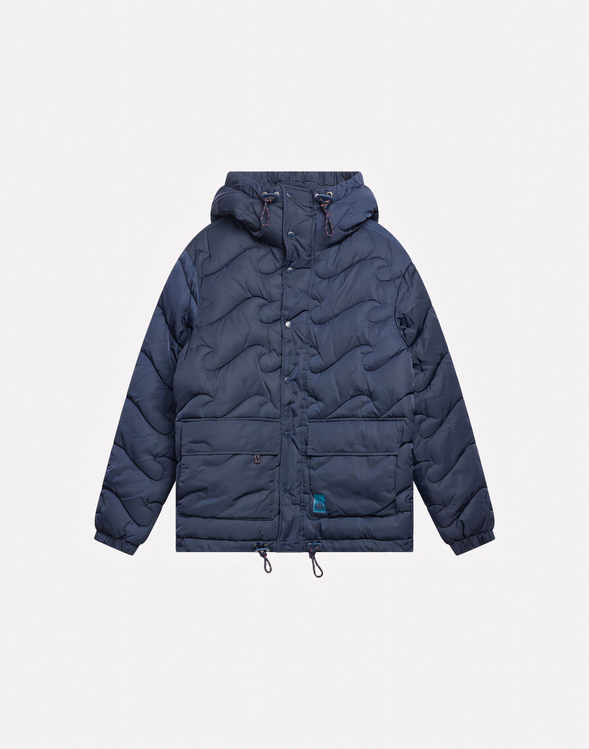 Heavy wave quilted down jacket with hood in Eco Sorona.