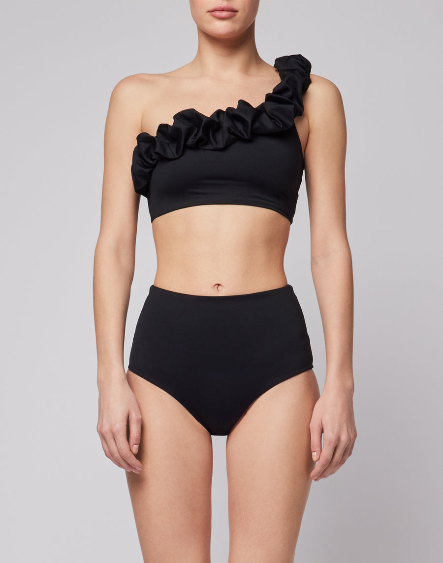 Stand out and show your romantic side with this one shoulder top with a ruffle that becomes the top perimeter and shoulder strap at the same time. perfect to wear even over more elegant trousers or a skirt, for more formal occasions, as well as for your moments on the beach.