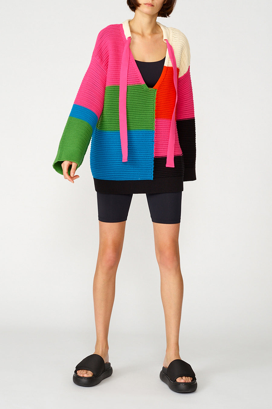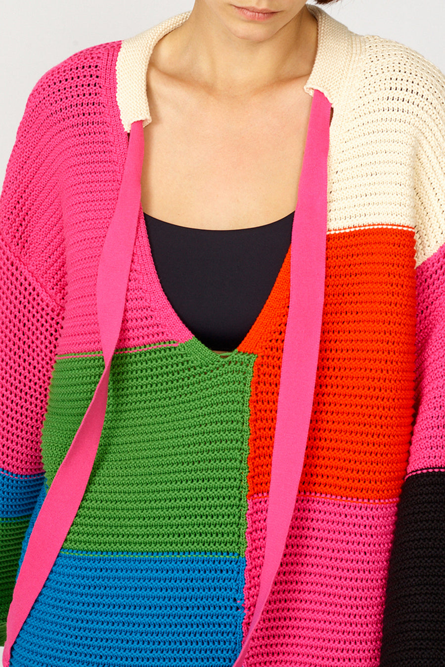 Be inspired by the colour block cardigan in combed cotton. Lively and versatile, it can be combined and worn in multiple ways.