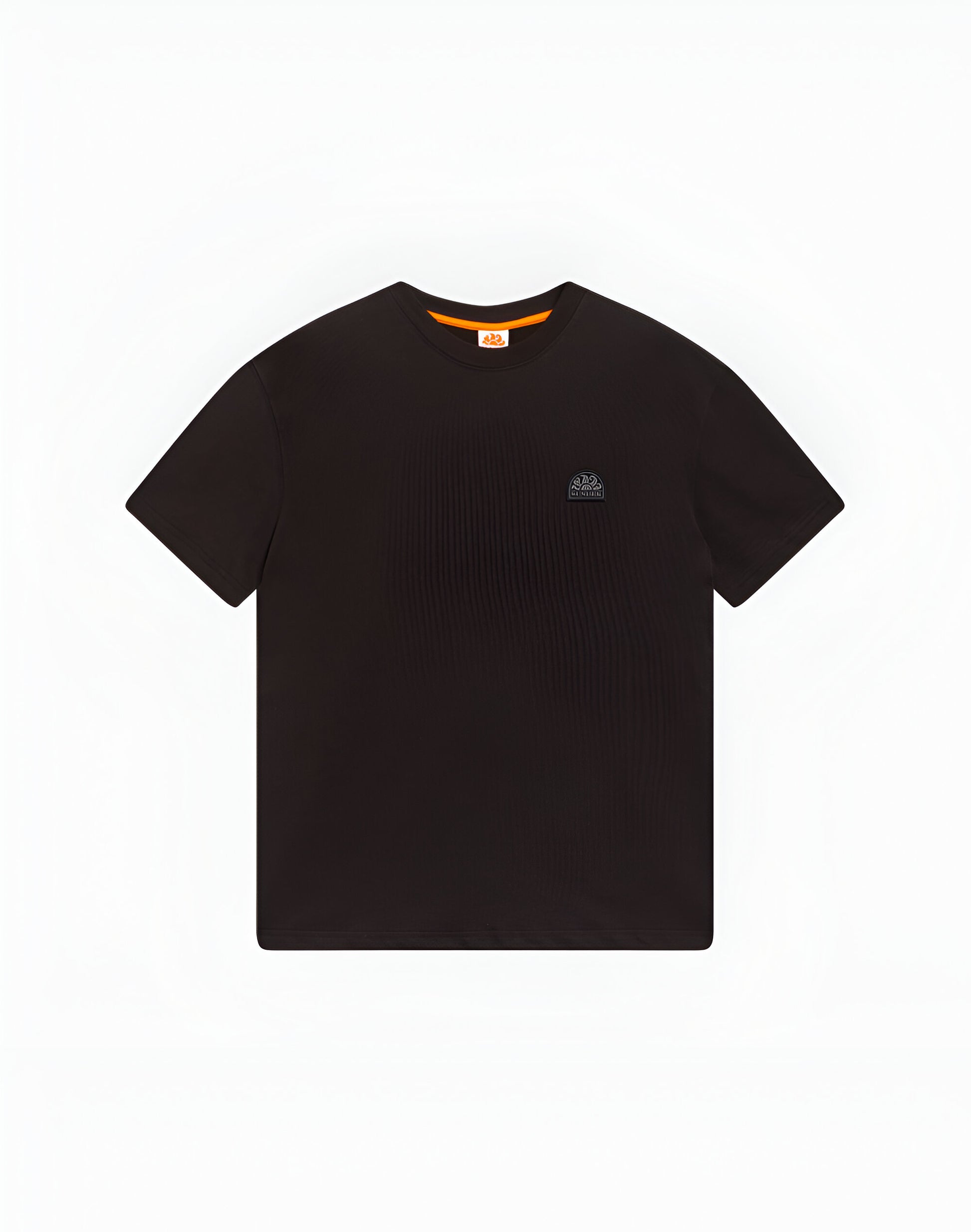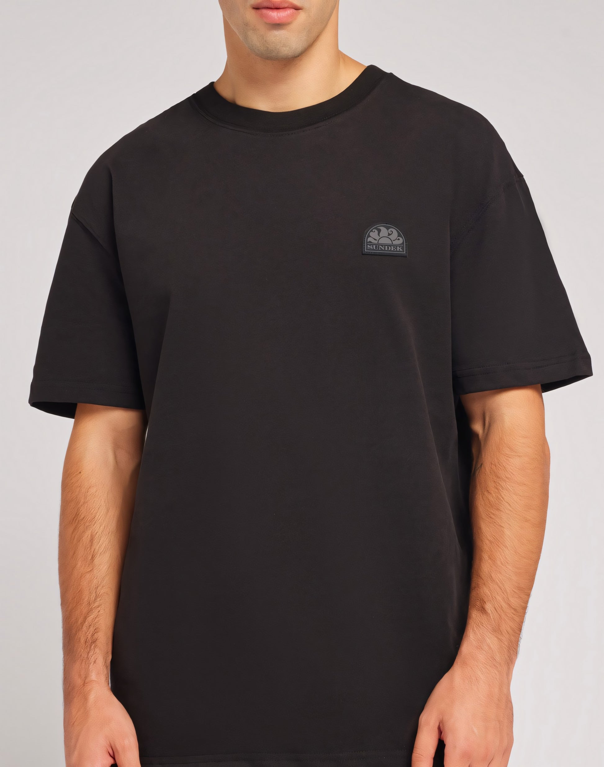 Men's crew-neck T-shirt in soft cotton jersey, with rubberized patch on chest. Loose fit. Perfect as the star of casual outfits.