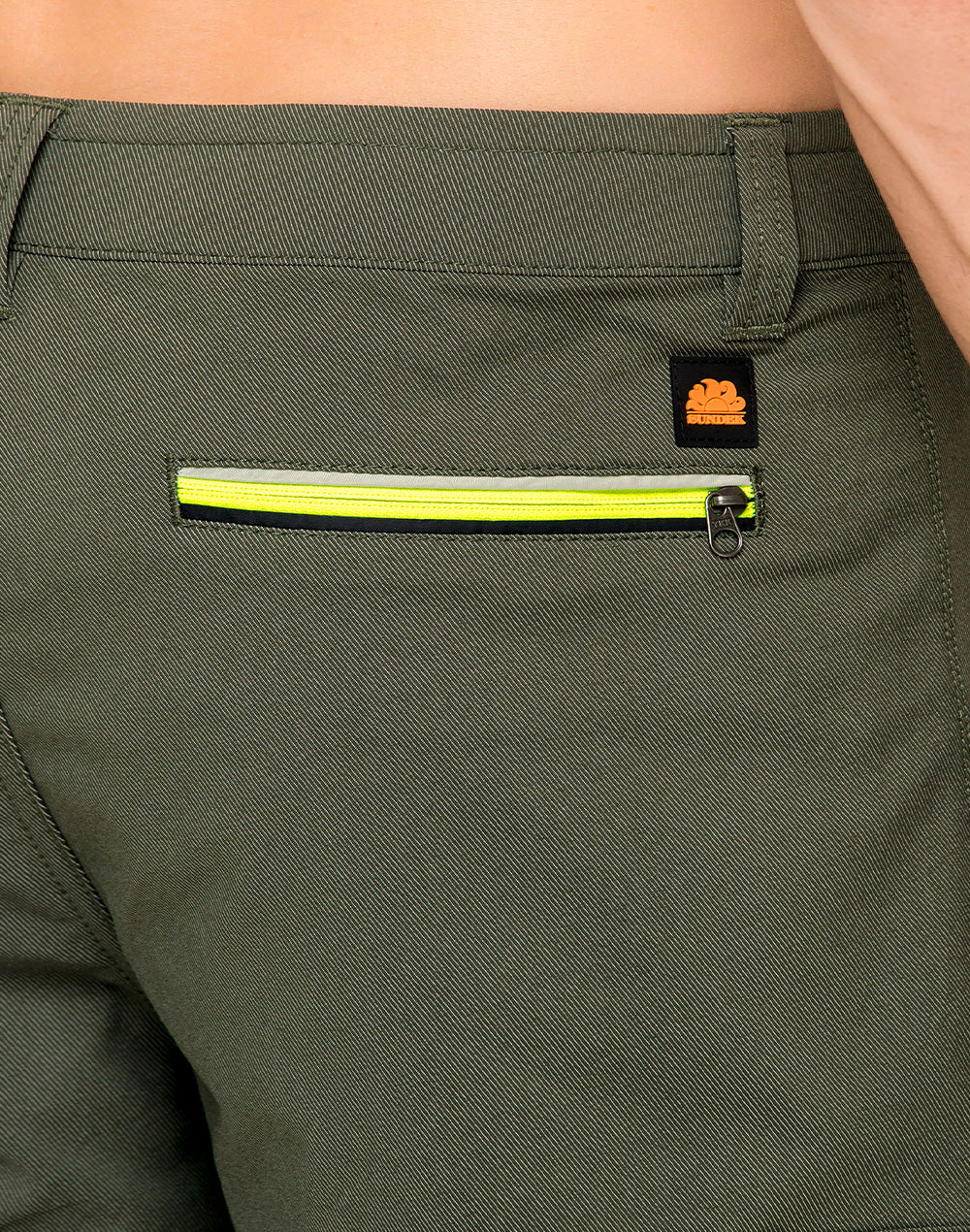 Back welt pocket with zip and tricolor detail