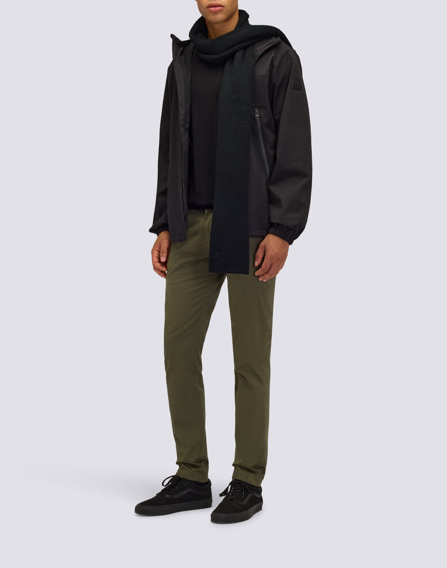 Men's short jacket in 3-layer bonded fabric. The outer layer of cotton/nylon is combined with an insulating membrane and an inner layer of polyester. The fabric is treated with a water-resistant finish on the outside. The inner membrane, on the other hand, helps reduce wind penetration. The garment is also lined with mesh, while the sleeves are lined with light nylon. Regular fit. Medium warmth. In cold temperatures, it is advisable to wear a padded jacket as an additional layer.