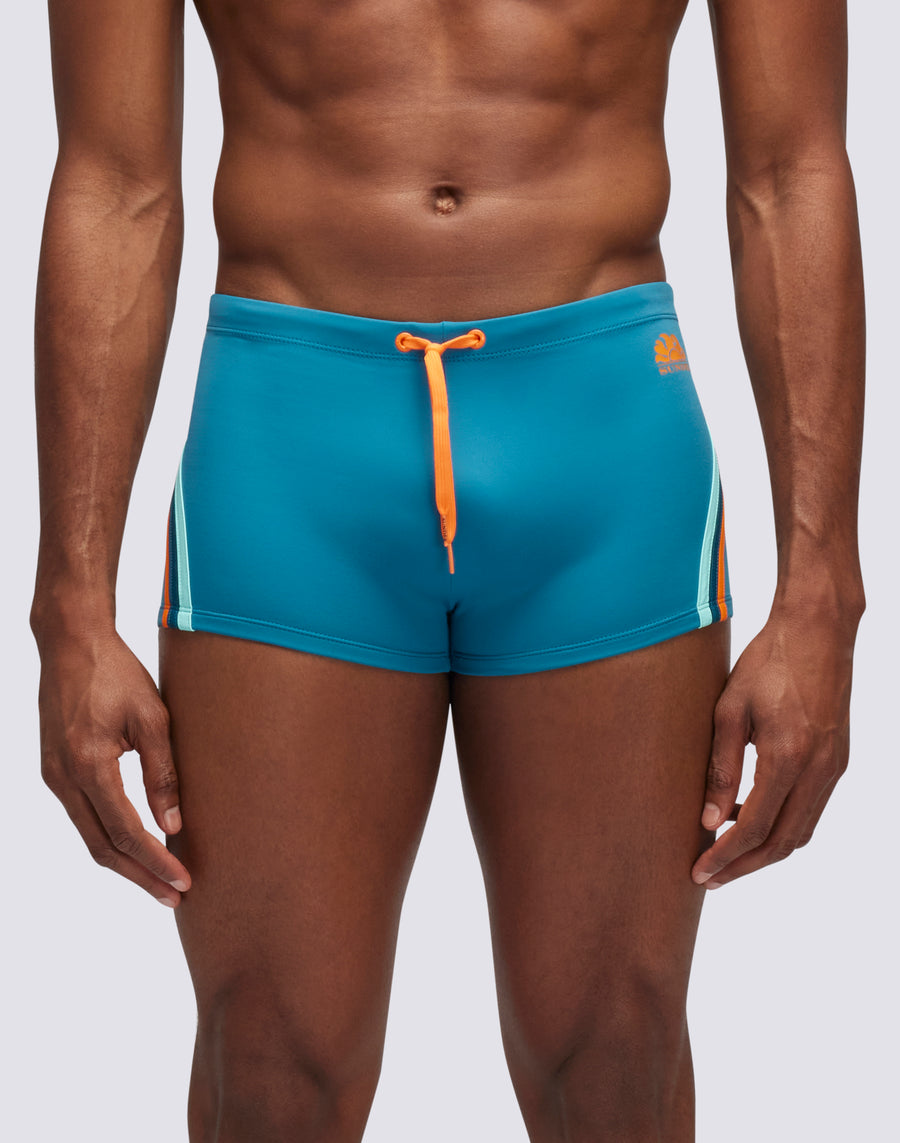 Men's swim boxer with adjustable waist with drawstring and contrasting drawstring: it is a timeless model in step with the times because it is eco-sustainable thanks to the ECONYL® regenerated fabric Made in Italy. You can wear it for swimming as well as for sunbathing and tanning. Outer leg length 9"/23cm (in size M).