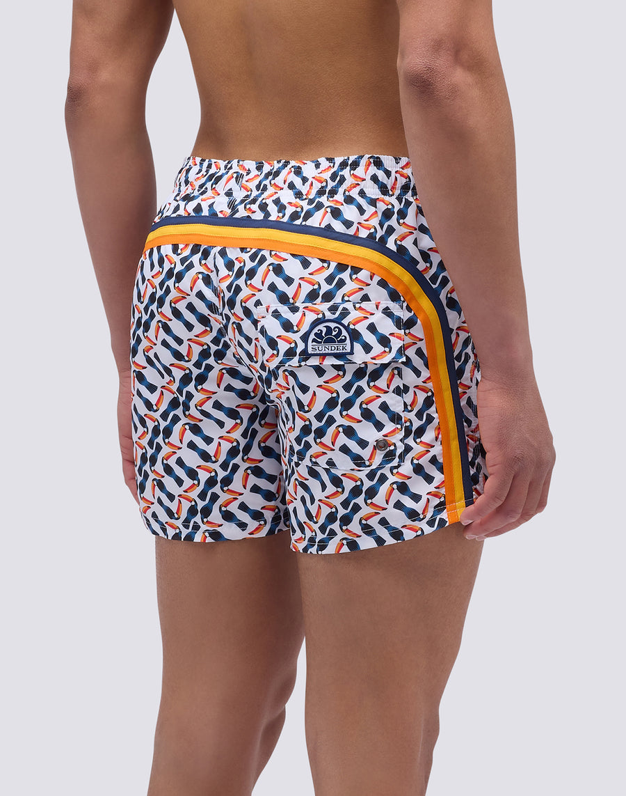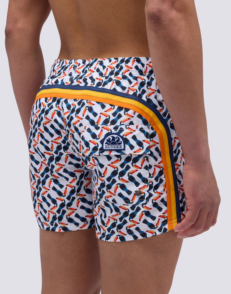 SHORT SWIMSUIT WITH ELASTIC WAIST AND MULTI TOUCAN PRINT