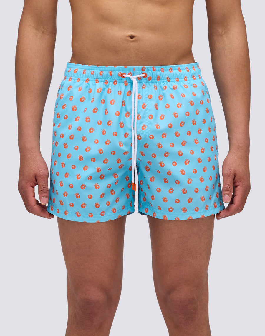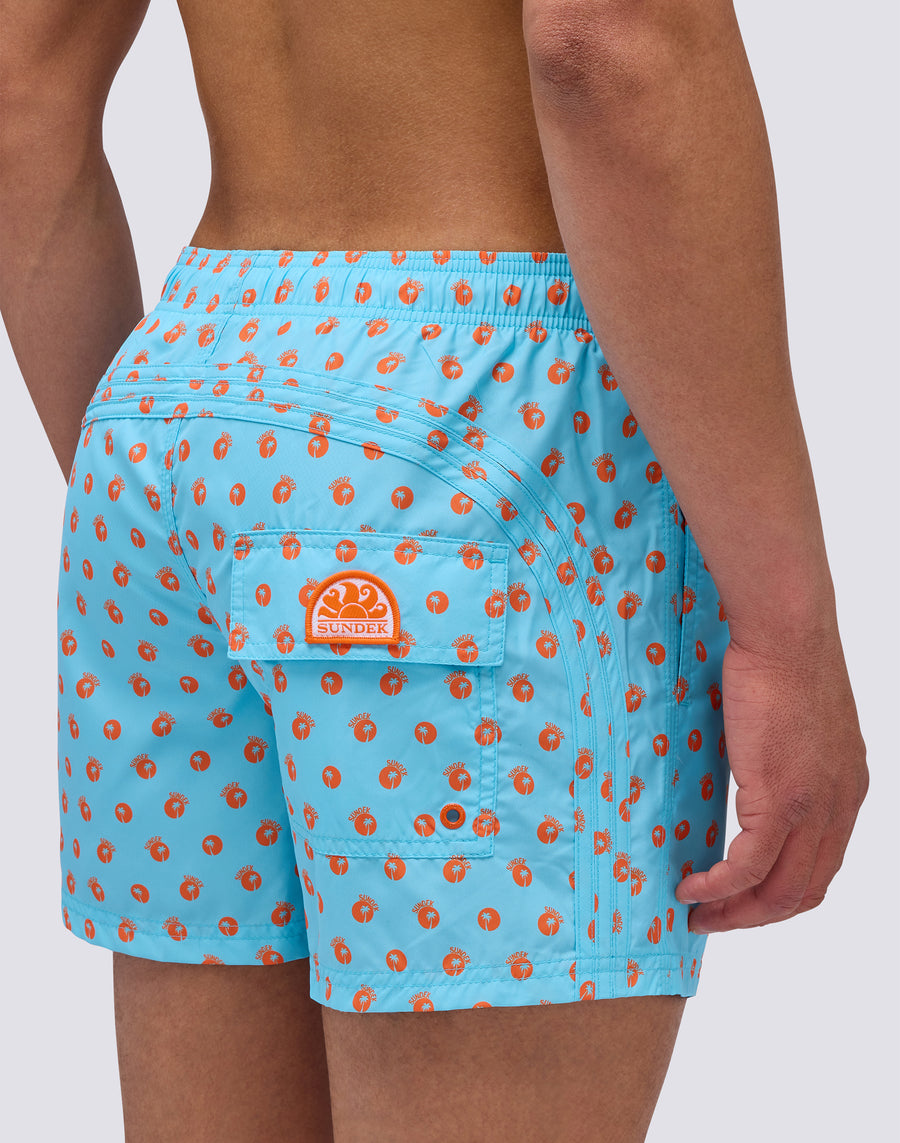 Swimshorts with elastic drawstring waistband, made from lightweight Repreve® fabric recycled from plastic bottles. Mini print and traditional Sundek rainbow on the back. Outer thigh width 14"/35 cm (size M).