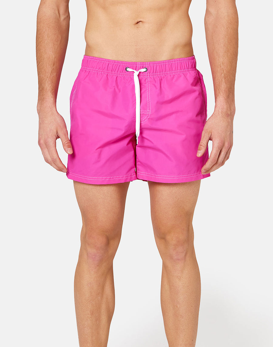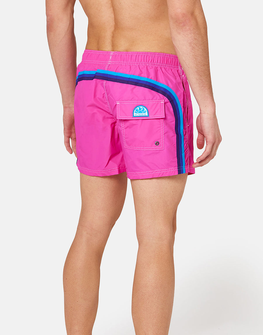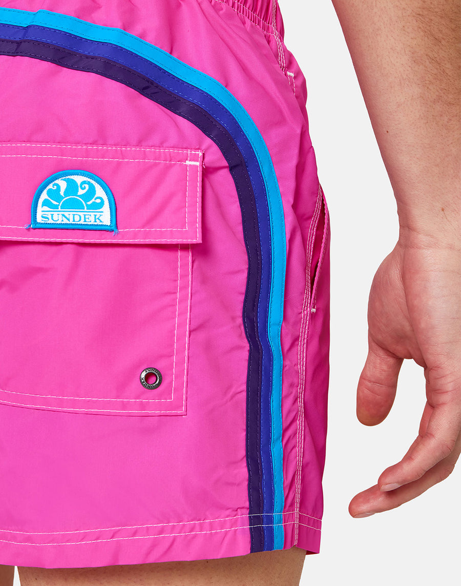 Short men's swim shorts with an elasticized waist, drawstring and iconic Sundek rainbow on the back. This swimsuit is made with three-needle stitching and 100 percent with our historic fabric, nylon-taffeta: silky smooth, lightweight and resistant to everything, it dries super fast to give you comfort anywhere, in the waves and out of the water.