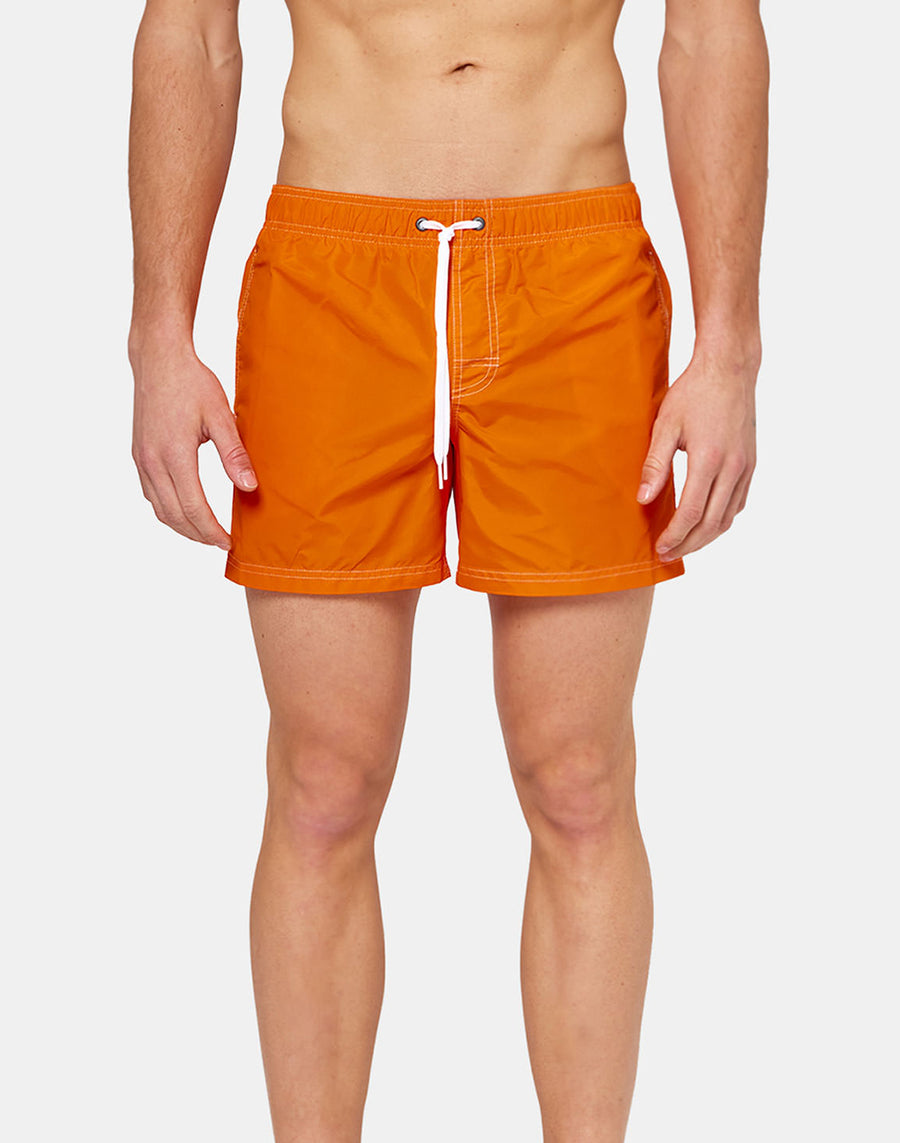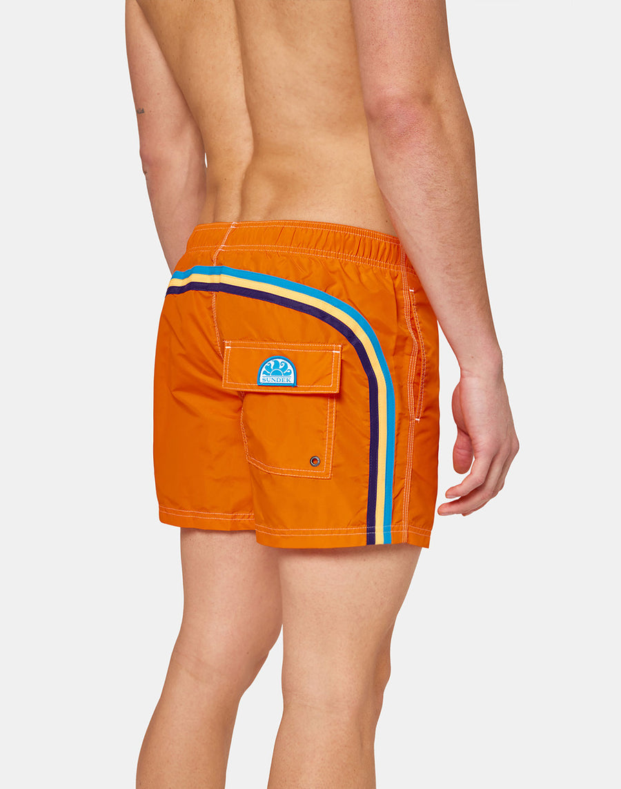 Short men's swim shorts with an elasticized waist, drawstring and iconic Sundek rainbow on the back. This swimsuit is made with three-needle stitching and 100 percent with our historic fabric, nylon-taffeta: silky smooth, lightweight and resistant to everything, it dries super fast to give you comfort anywhere, in the waves and out of the water.
