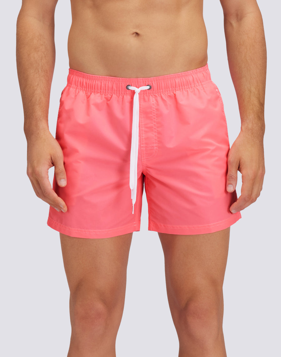 Short men's swim shorts with elasticated waist, drawstring and iconic Sundek rainbow on the back. This swimsuit is made with three-needle stitching and 100% of our historic fabric, nylon-taffeta: smooth as silk, light and resistant to everything, it dries very quickly to give you comfort everywhere, in the waves and outside waterfall. Length 35 cm (size M), measured on the outside of the leg.