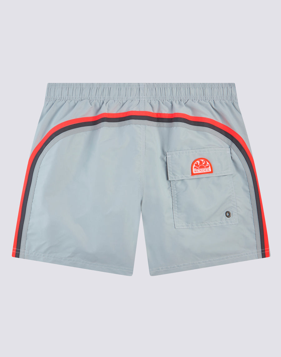 Short men's swim shorts with elasticated waist, drawstring and iconic Sundek rainbow on the back. This swimsuit is made with three-needle stitching and 100% of our historic fabric, nylon-taffeta: smooth as silk, light and resistant to everything, it dries very quickly to give you comfort everywhere, in the waves and outside waterfall. Length 35 cm (size M), measured on the outside of the leg.