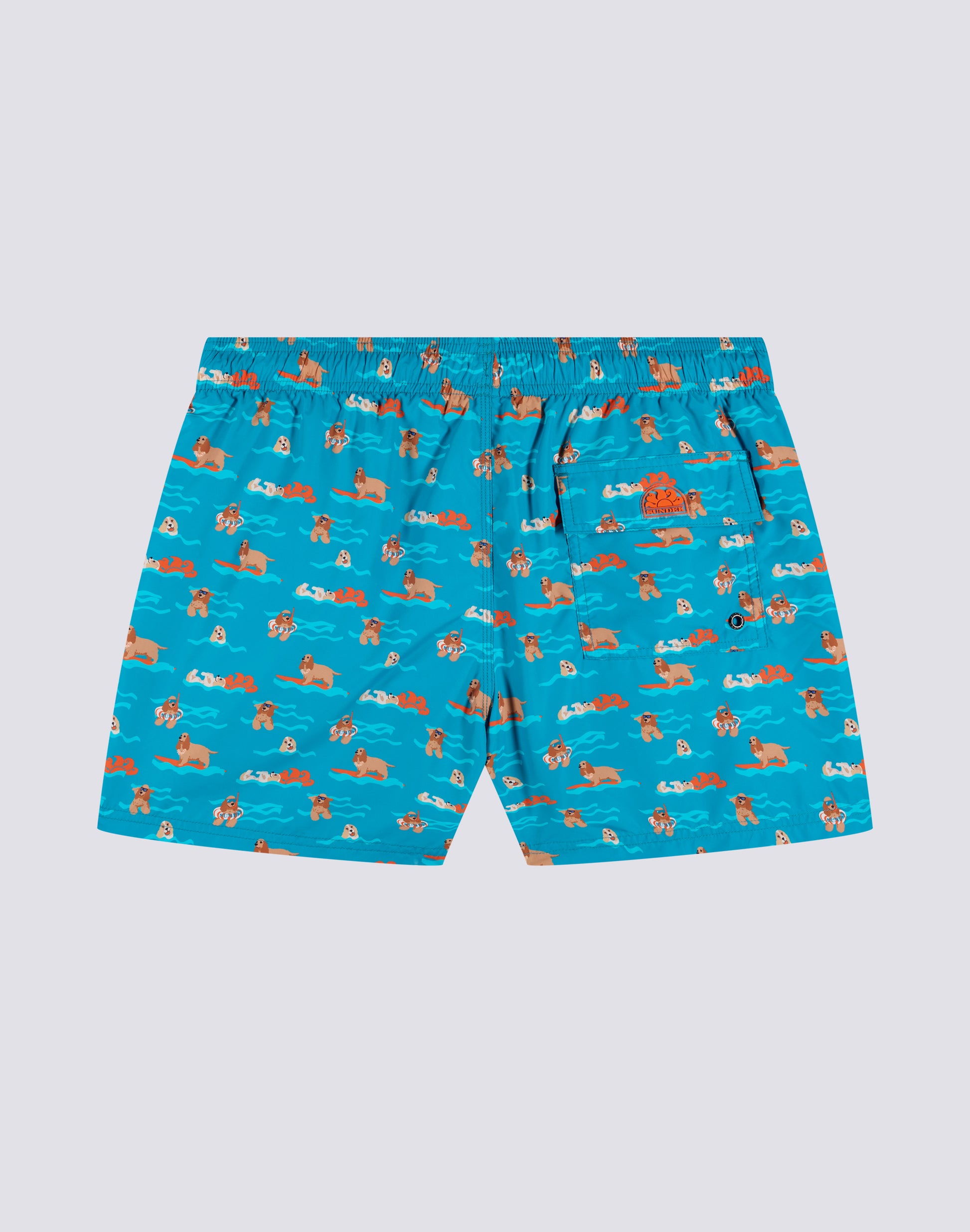 Men's swimshorts from the Pelo capsule collection, dedicated to four-legged friends. This "Surfer Cocker" model features a cute surfing cocker and is made of recycled polyester. Perfect for dog lovers who want a comfortable, sustainable and uniquely designed garment for days at the beach.
