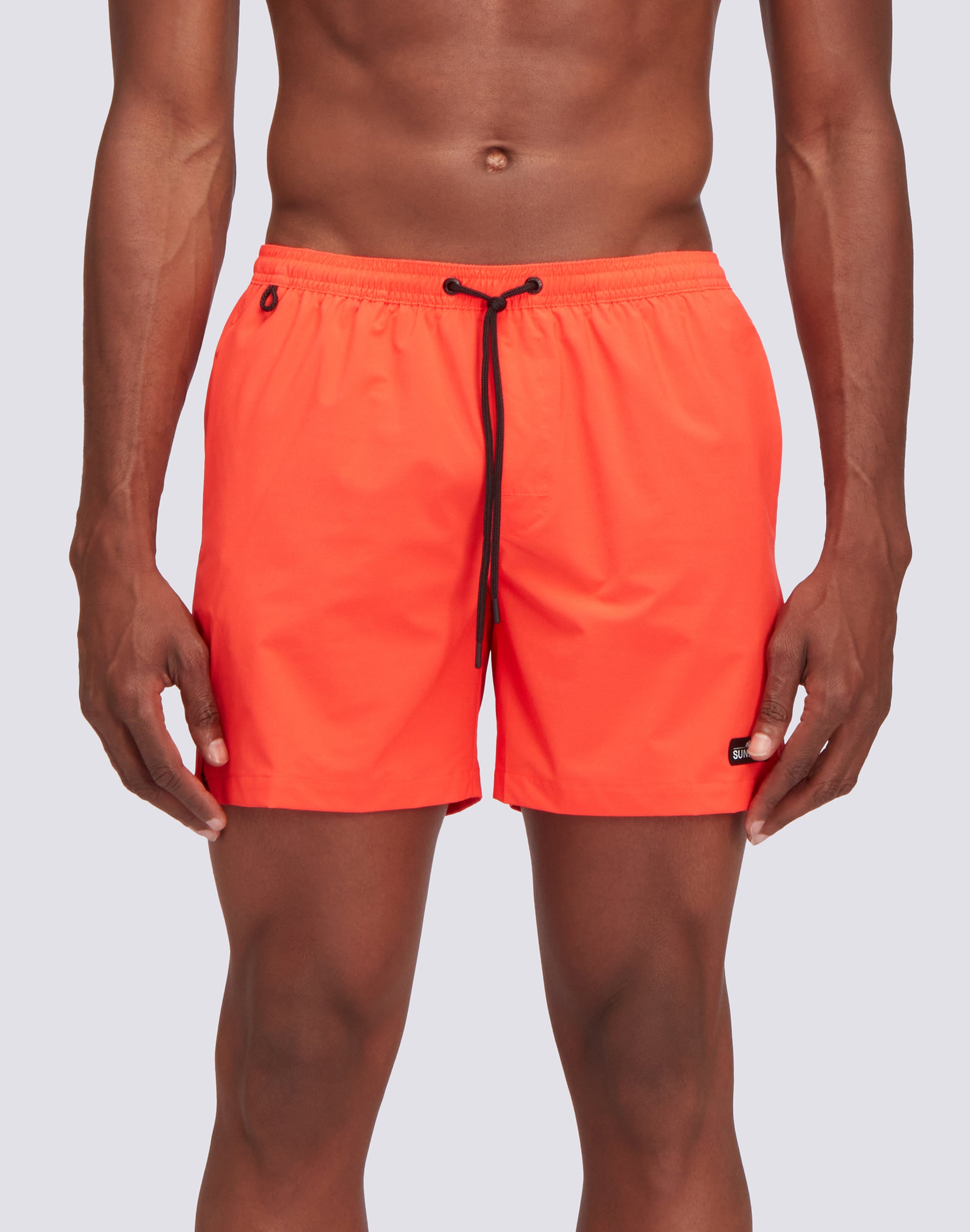 Follow the waves wearing the elastic-waisted men's swimshorts in bright colours. Lightweight, durable, quick-drying and made of 4 Way Stretch fabric. It has a practical removable waterproof pouch, attached to the waist like a key ring; ideal for keeping your mobile phone with you, without having to use pockets or other external bags. It also has Sundek's classic three-needle stitching for added durability and our iconic rainbow on the back.
