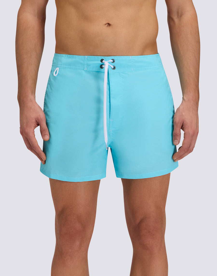 New in the 2026 collection! Men's swim shorts with a semi-elastic waistband , drawstring, and the iconic Sundek rainbow on the back. This swimsuit is made with three-needle stitching and 100% of our signature nylon taffeta fabric: silky smooth, lightweight, and durable, it dries incredibly quickly for comfort everywhere, in and out of the water. Length: 35 cm (size M), measured along the outside of the leg. The semi-elastic waistband features an elasticated section at the back and a fixed section at the front.