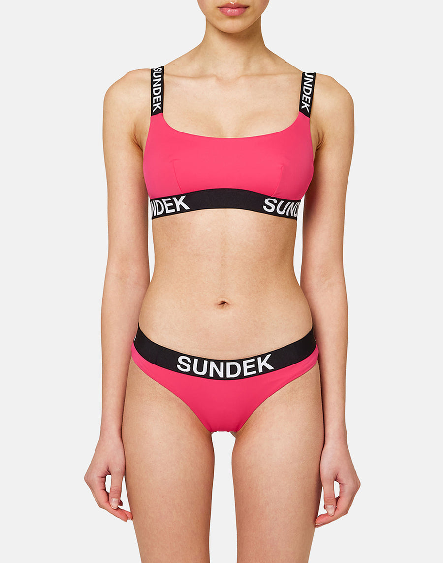 Made from eco-friendly and comfortable fabric, this non-padded balconette top is finished with a jacquard elastic underbust band with contrasting Sundek logos. The perfect choice to make a splash in sporty chic style.