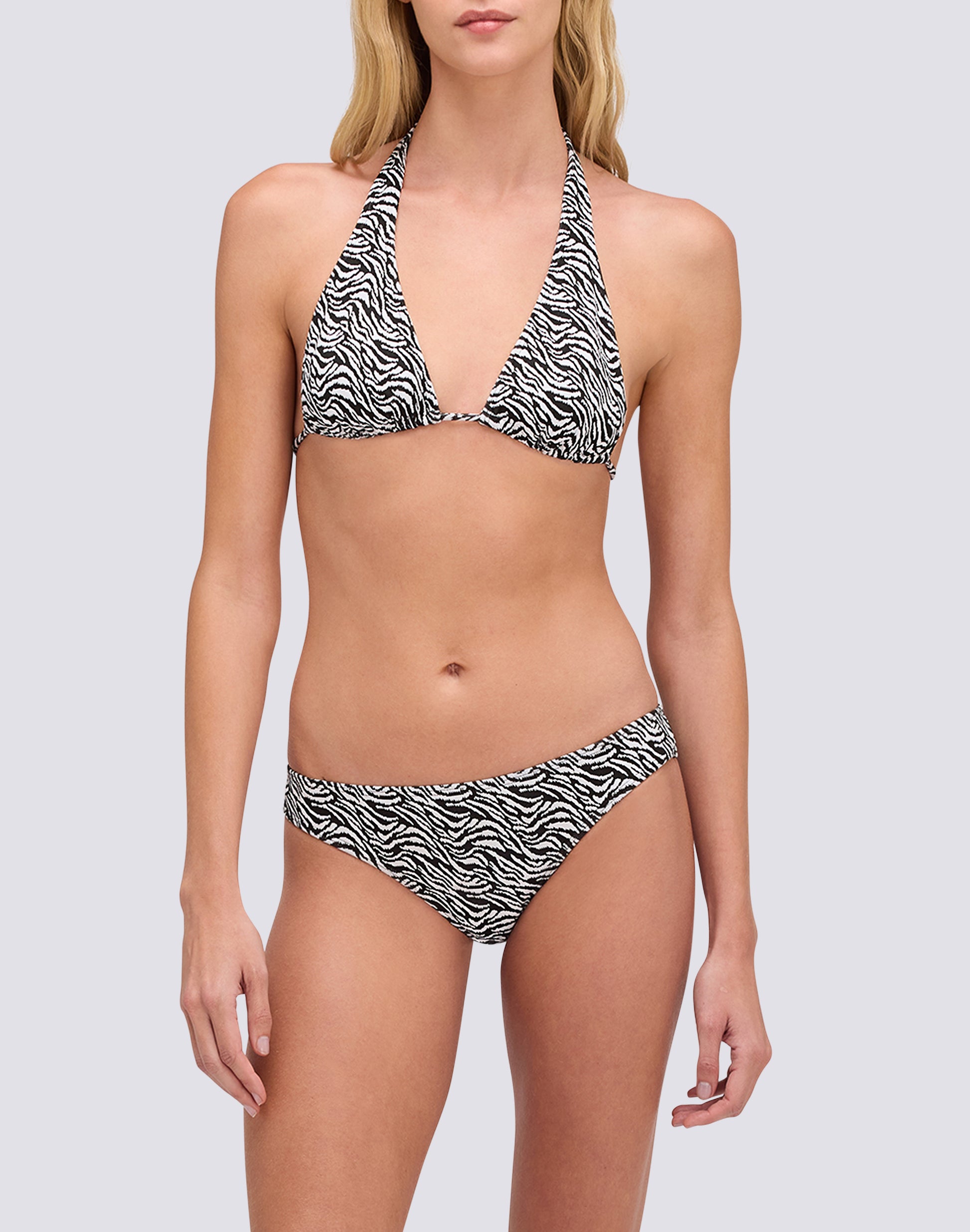 The Hila American triangle bikini top with zebra print in jacquard Lycra combines animal print and texture. The zebra print is a bold, graphic animal print that adds character. An iconic design with sharp contrasts, perfect for those who love a style that stands out. Jacquard Lycra combines elasticity and three-dimensional construction. This texture creates a unique tactile and visual effect, richer than smooth fabrics. The zebra pattern becomes an integral part of the fabric, not just a simple print. Ties at the neck and back for a customised fit. Adjust to your preferences for ideal support and comfort. Adapt the top to your body shape.