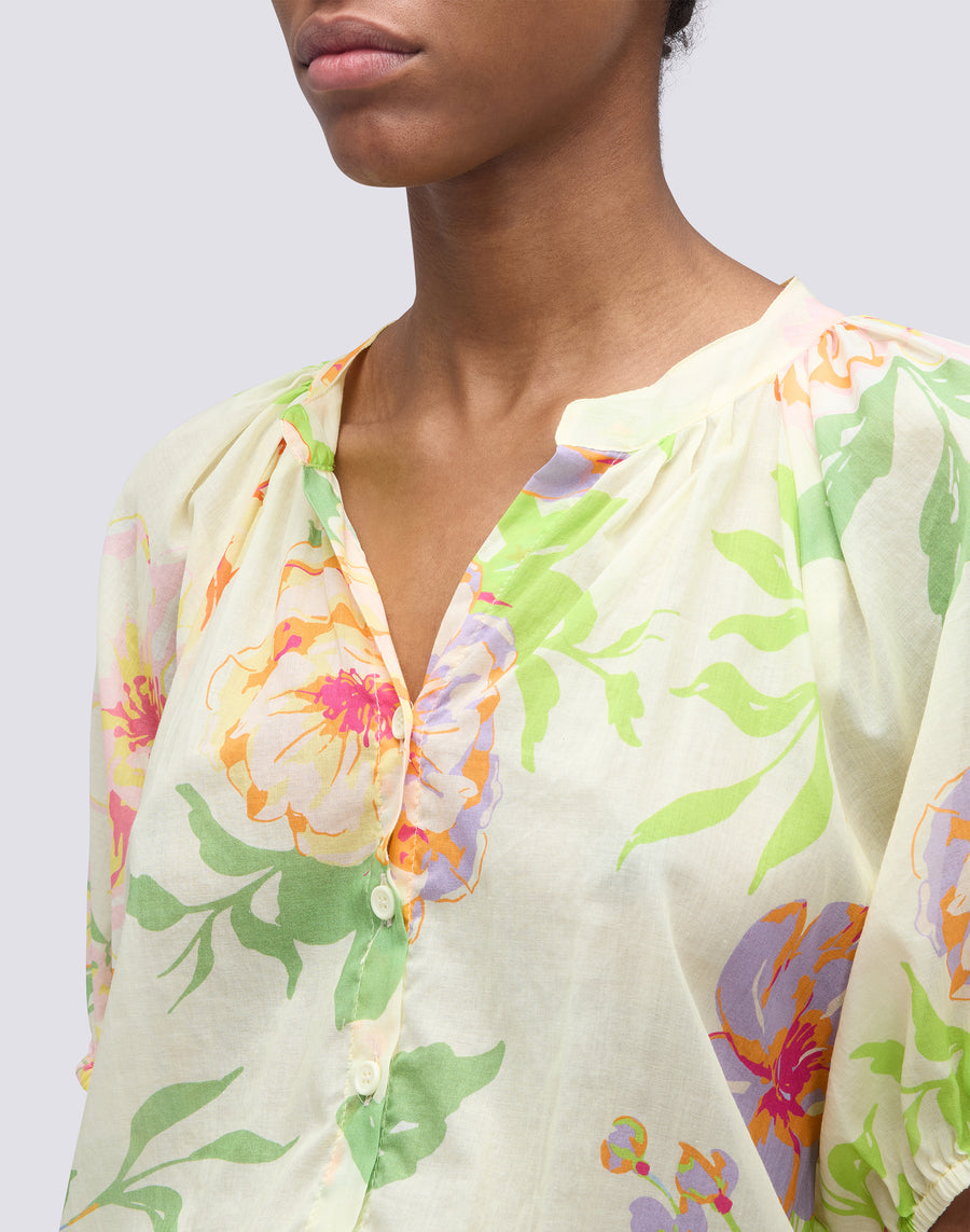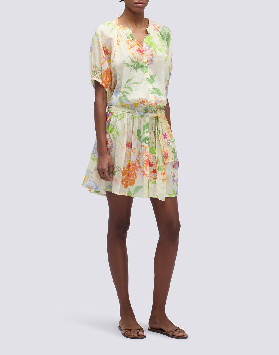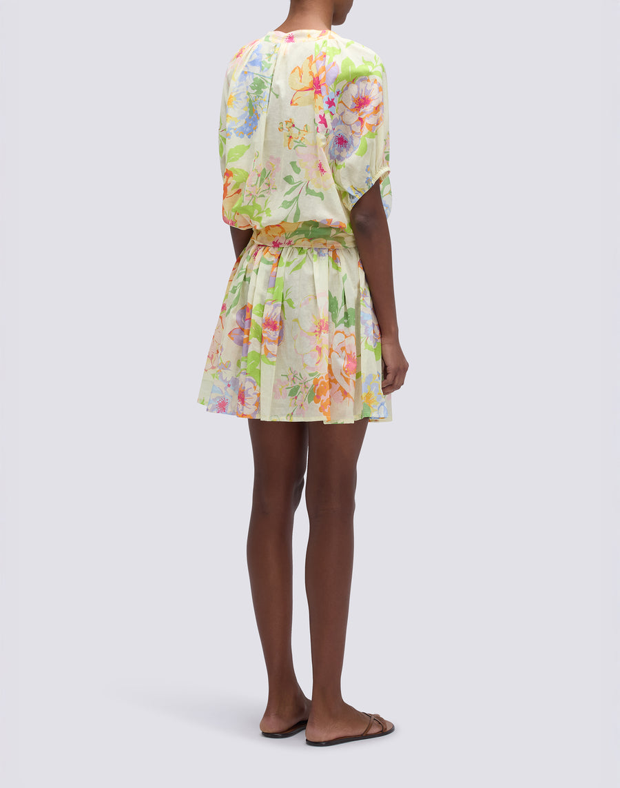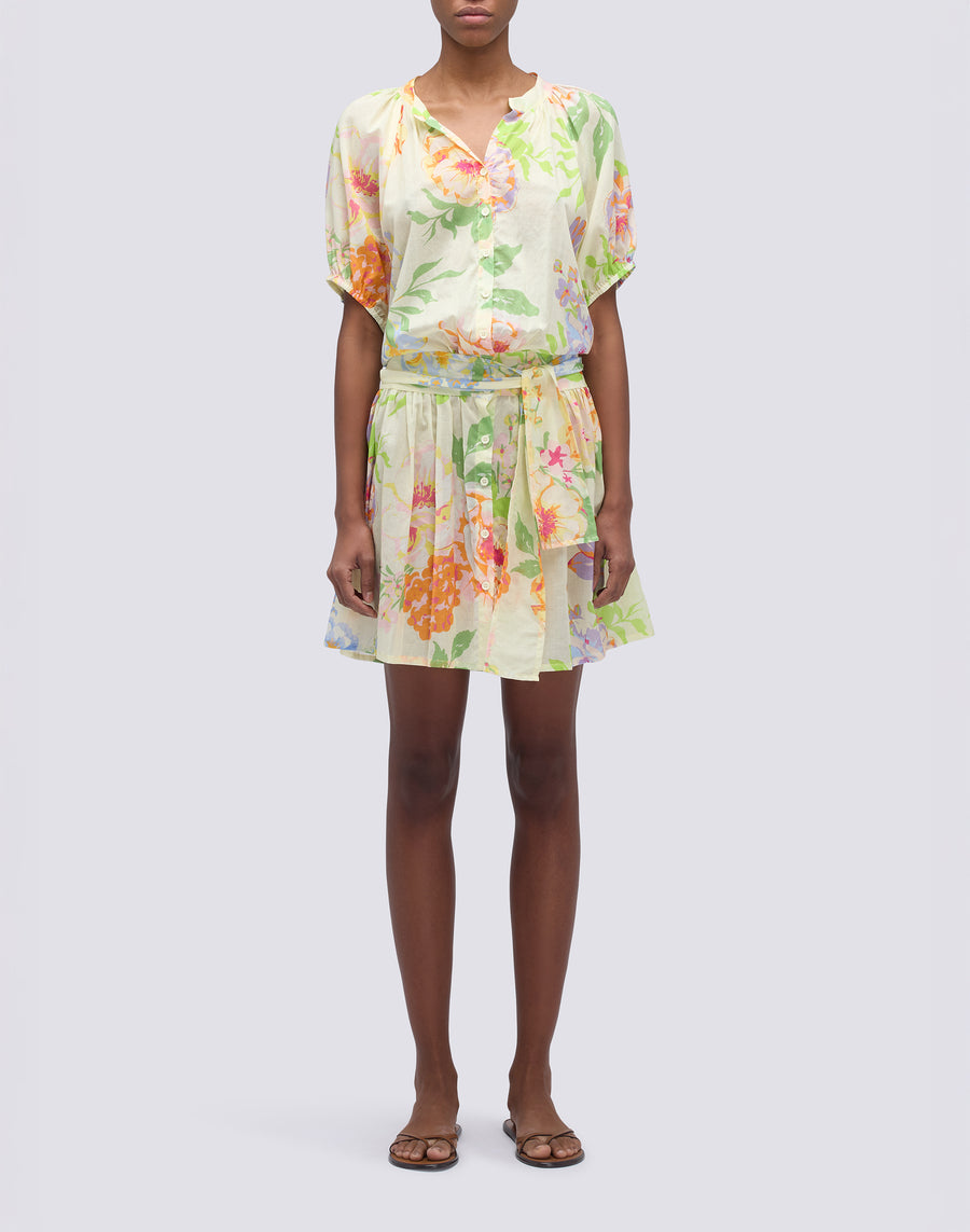 Women's short dress in cotton voile with elegant Flower Bunch print. Rich in detail, it is ideal for colourful outfits for your summer occasions or evenings.
