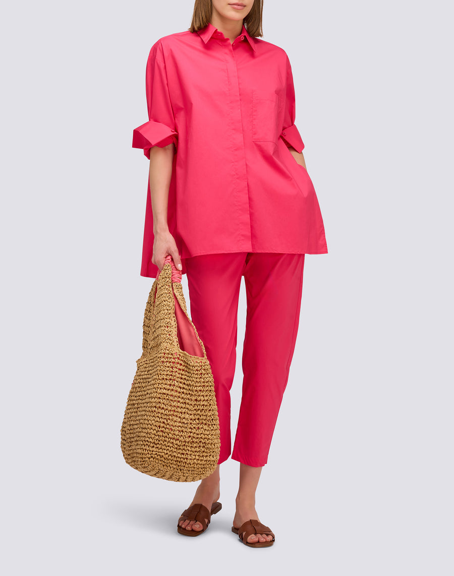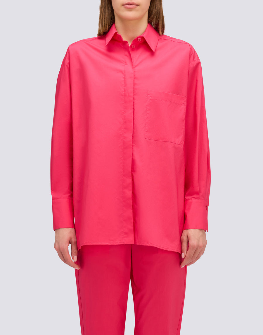 Cotton popelin over fit shirt with front pocket and side vents. A garment with a simple design, but with stylish details. A must-have for your Spring Summer wardrobe!