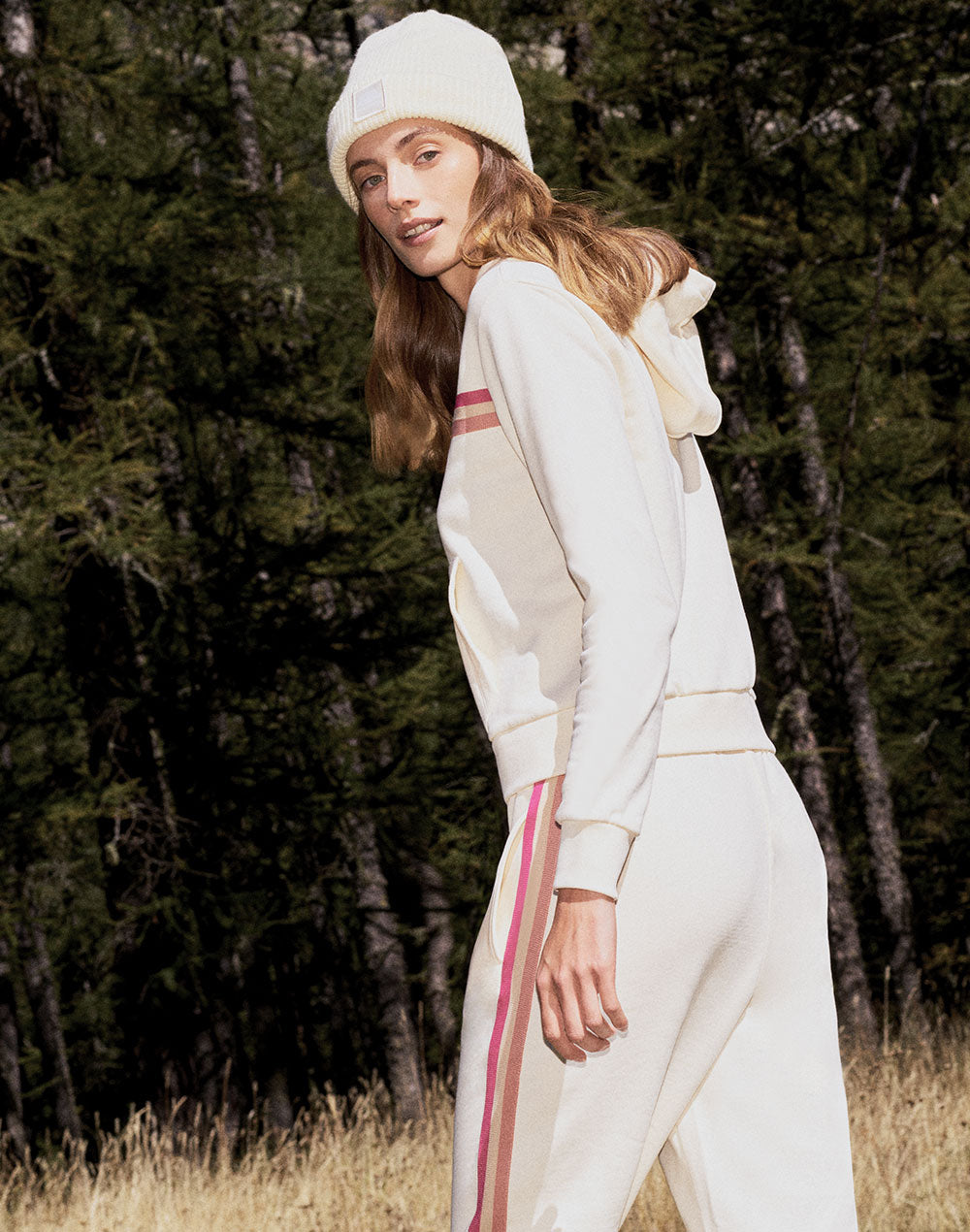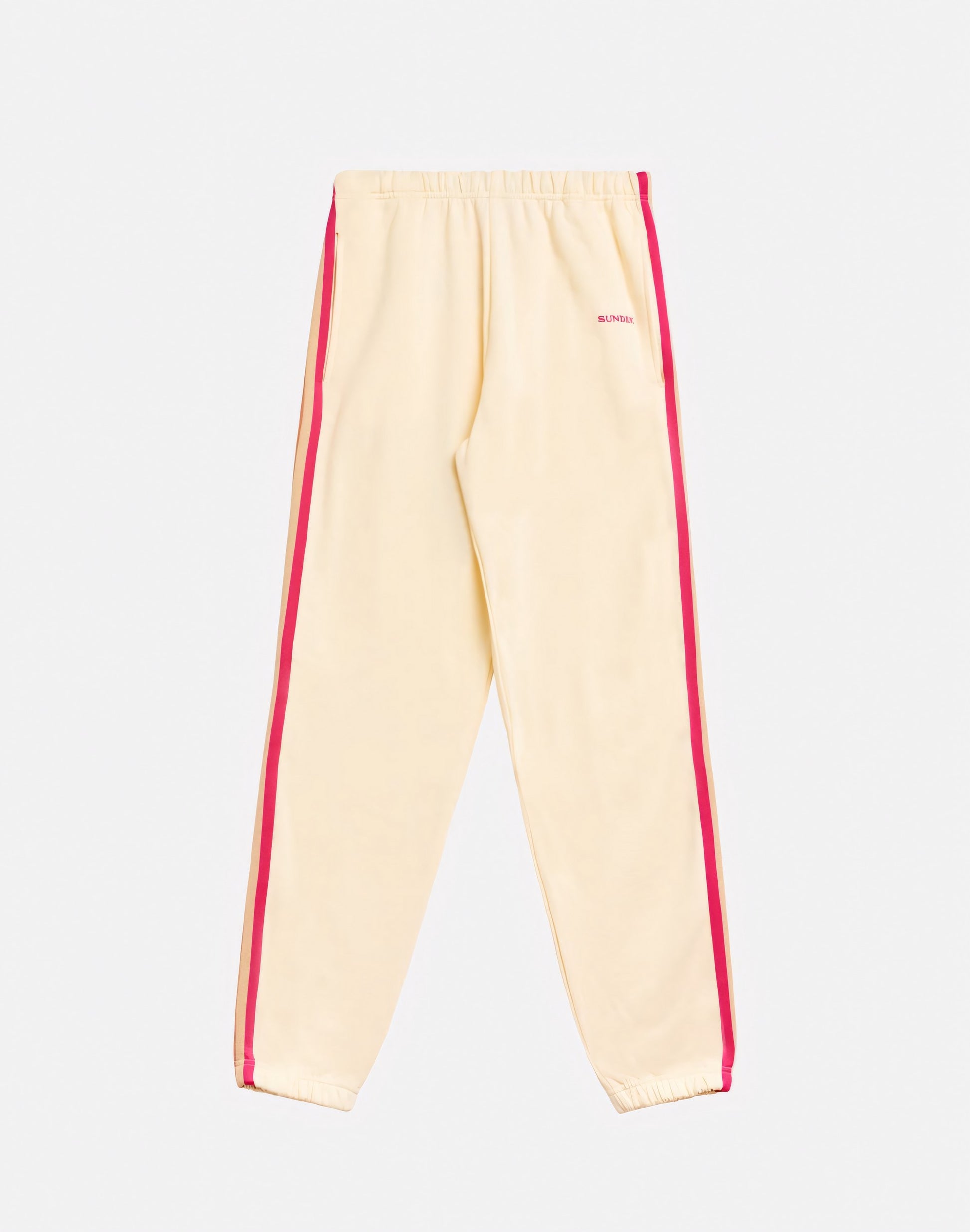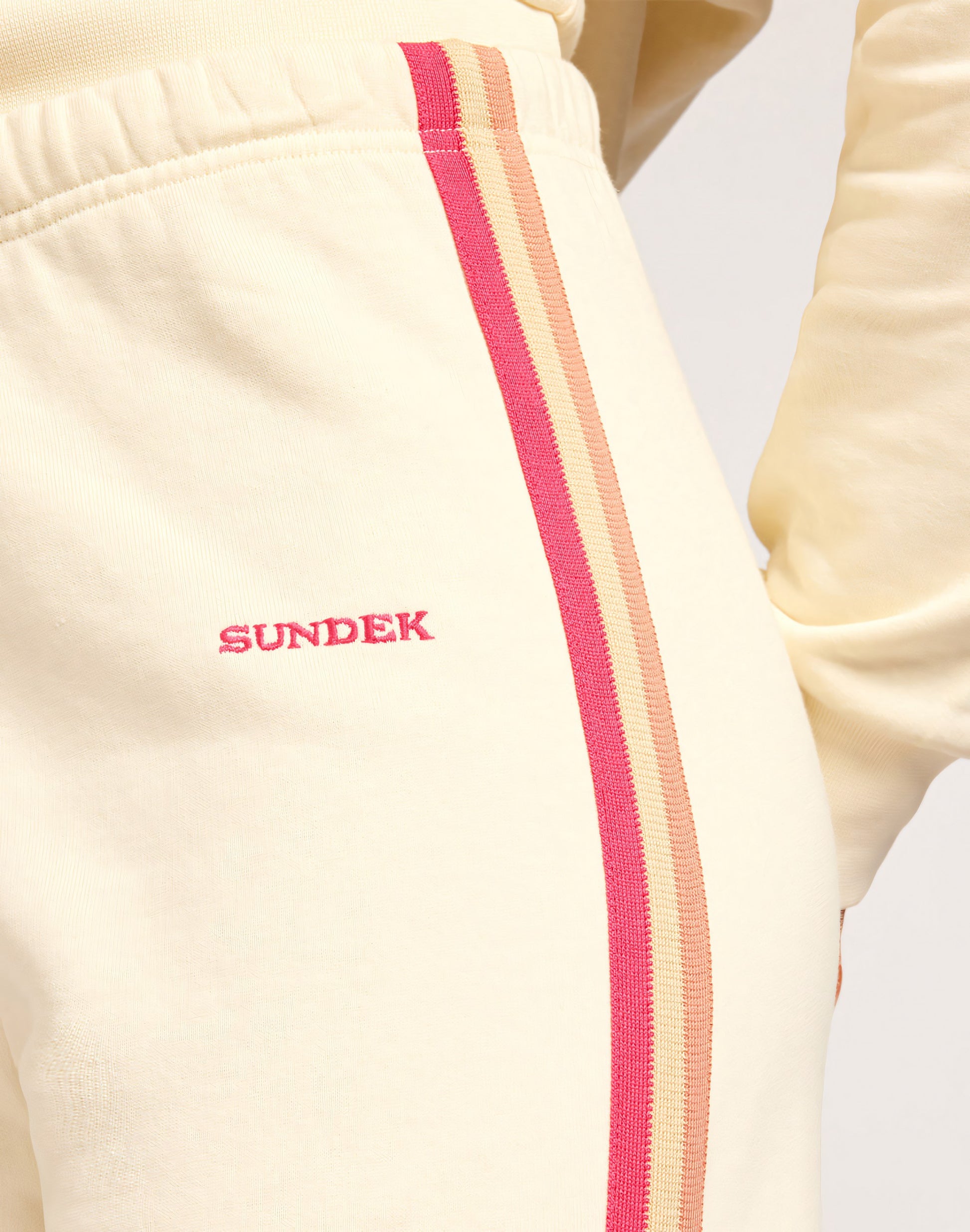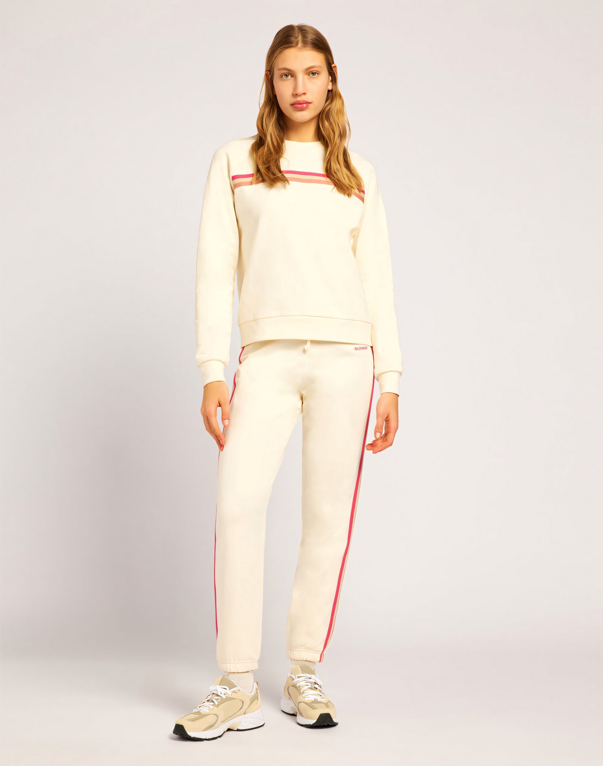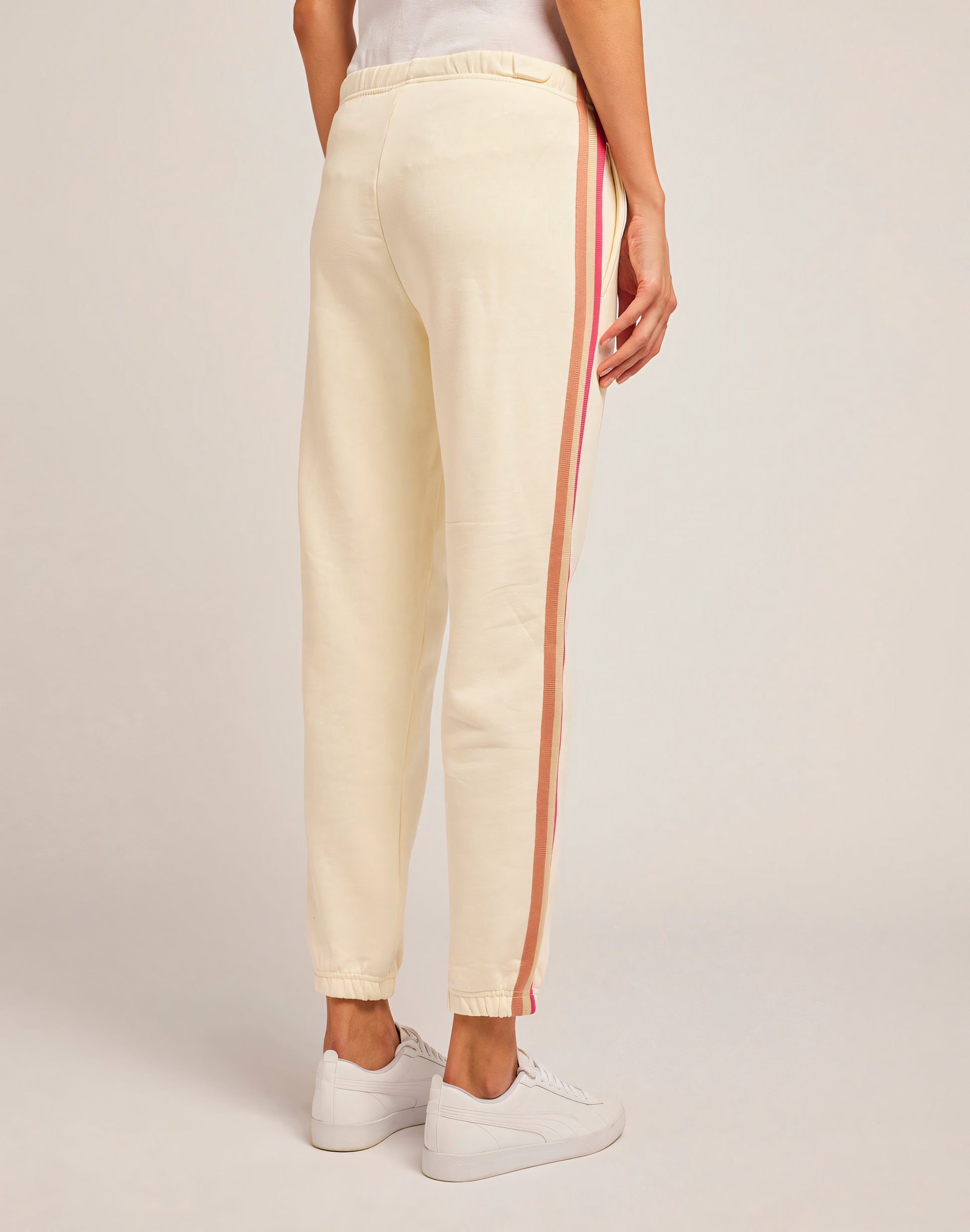 Essential and comfortable, these gauzy fleece trousers feature an elasticated hem, an elasticated waistband and a lively rainbow detail at the sides. Perfect everyday design.