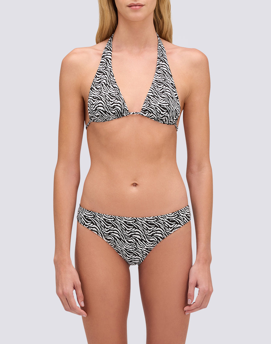 The Vega culotte briefs with zebra pattern in jacquard Lycra combine coverage and style. The culotte cut offers medium coverage at the back, more covered than the Brazilian, but higher cut than the classic. The zebra pattern is a graphic animal print that adds instant character. A bold design, perfect for those who love a style that stands out. Jacquard Lycra combines elasticity and three-dimensional construction. This premium texture creates a unique tactile and visual effect, richer than smooth fabrics. The zebra pattern becomes an integral part of the fabric, not just a simple print. The high-cut of the culotte enhances the silhouette without revealing too much. Perfect when paired with the Hila triangle top in the same pattern.