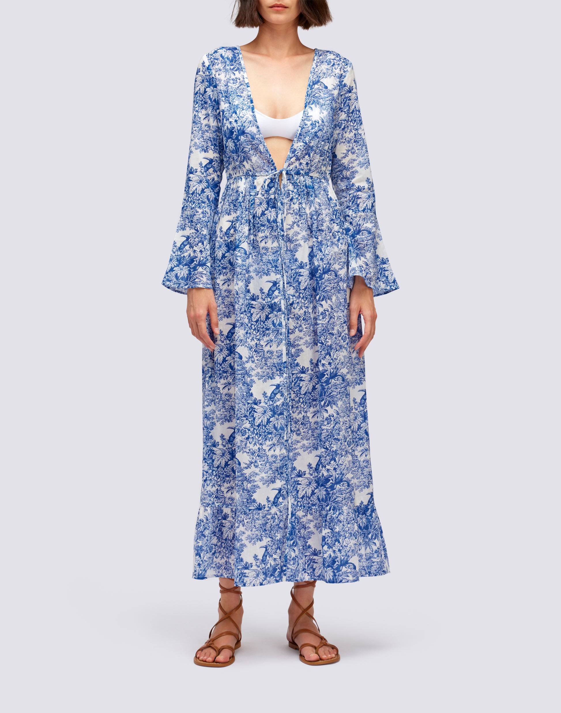 This long kaftan, with a drawstring waist, is made of fine cotton and features a delightful Toile De Jouy print. Perfect for a day at the beach or an evening. To be combined with a plain costume or its coordinated set.
