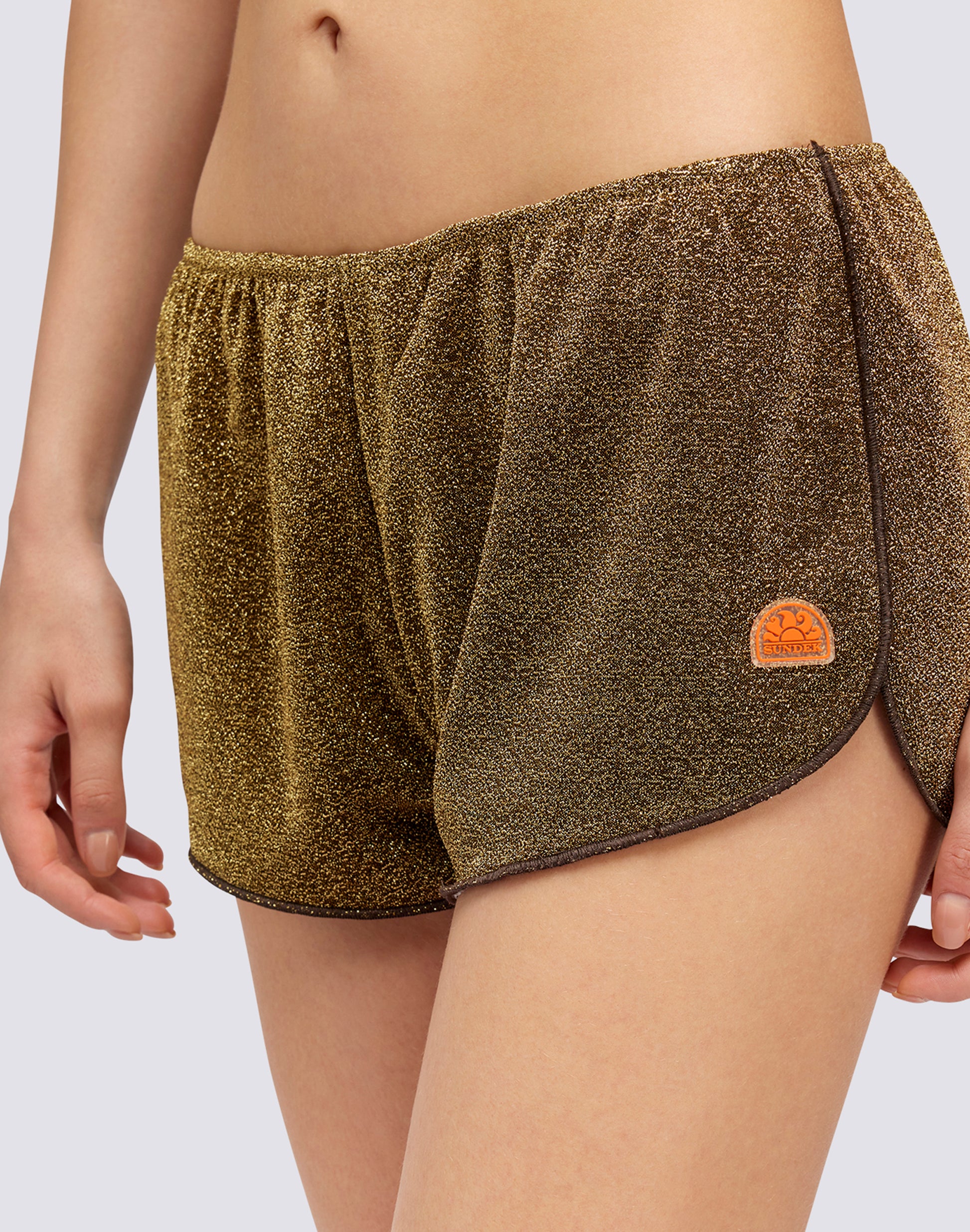 Short and light women's swim shorts in lurex, easy to match with your favorite swimsuit to make every day at the beach perfect.