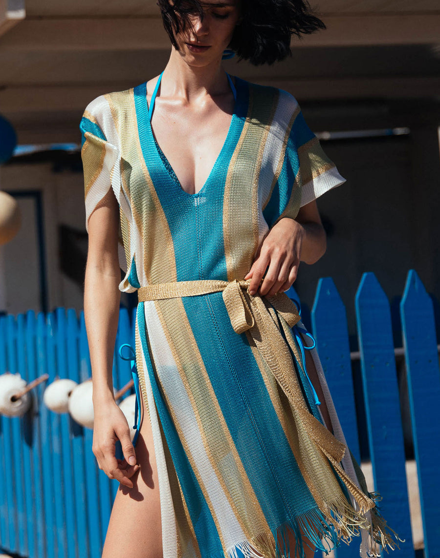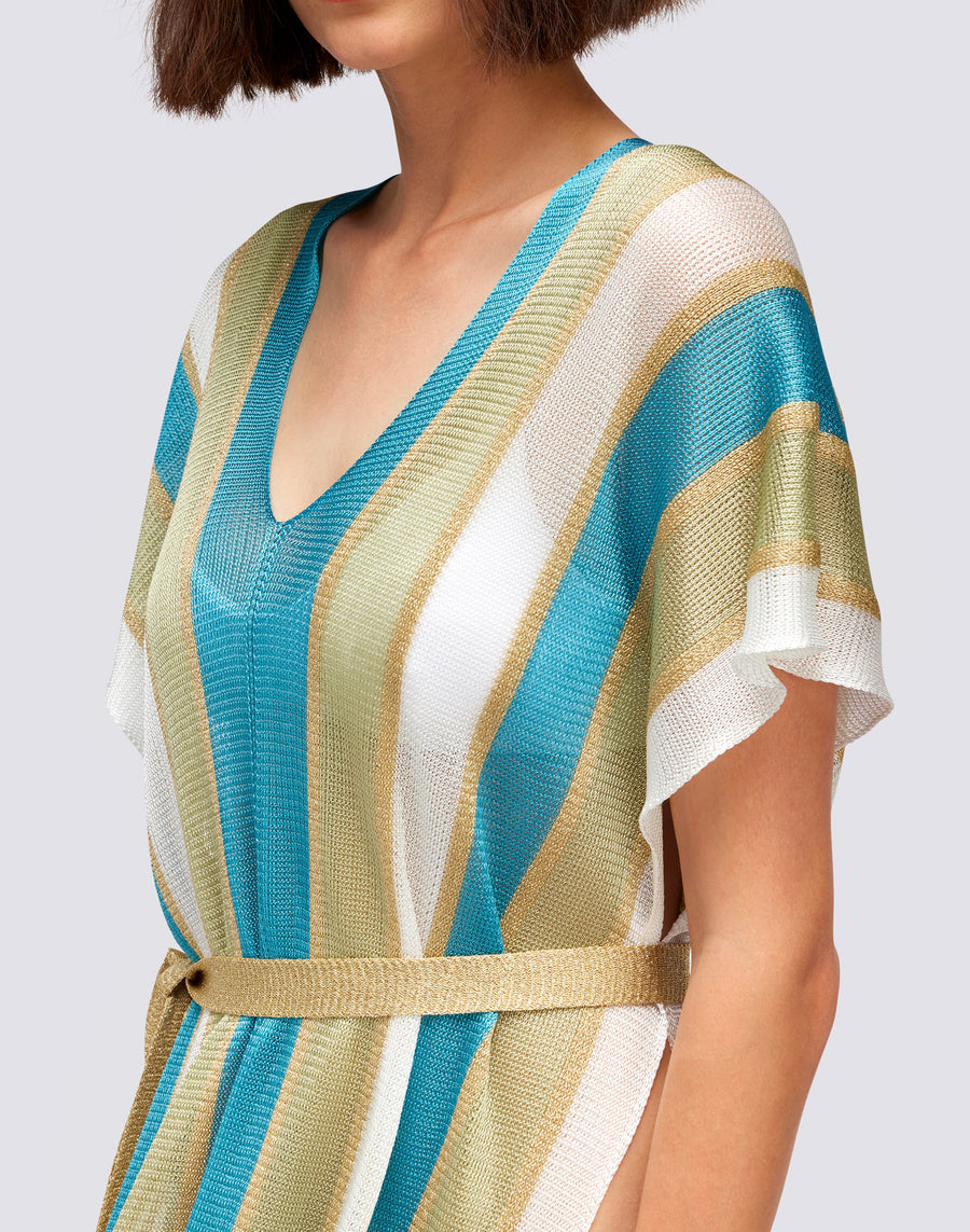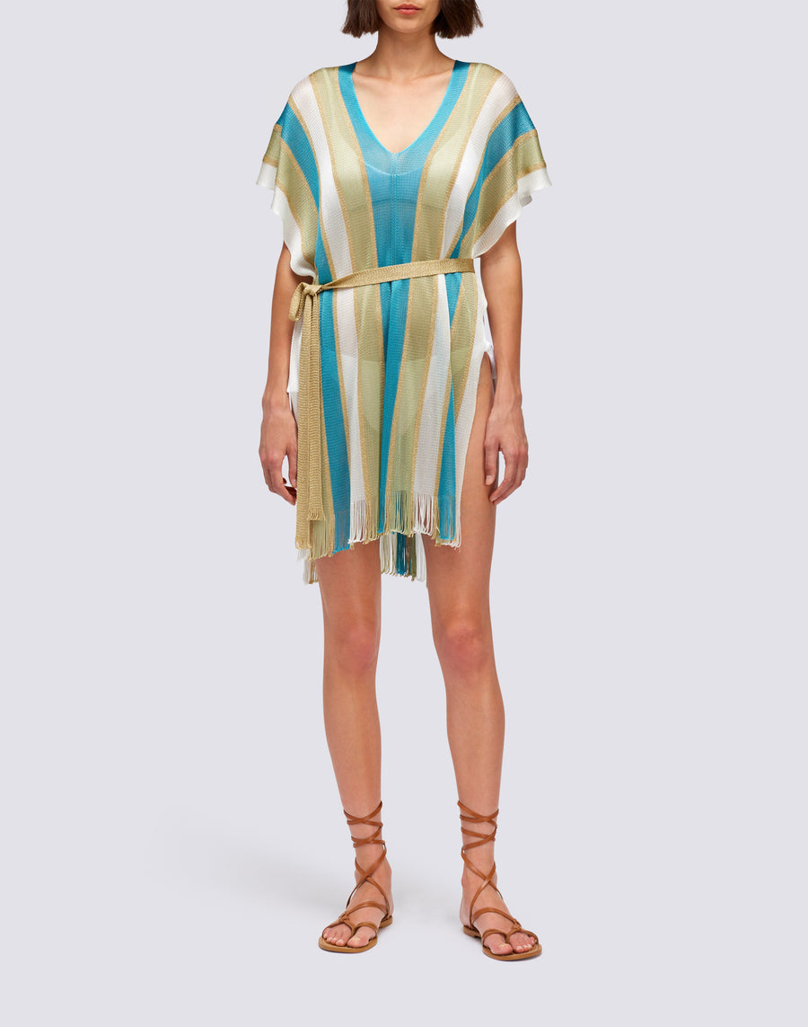 Add a pop of color to your summer look with our lurex kaftan. With its fringes and belt at the waist, it is the perfect choice for a bright and sophisticated outfit. Wear it over costumes for an extra touch of style.
