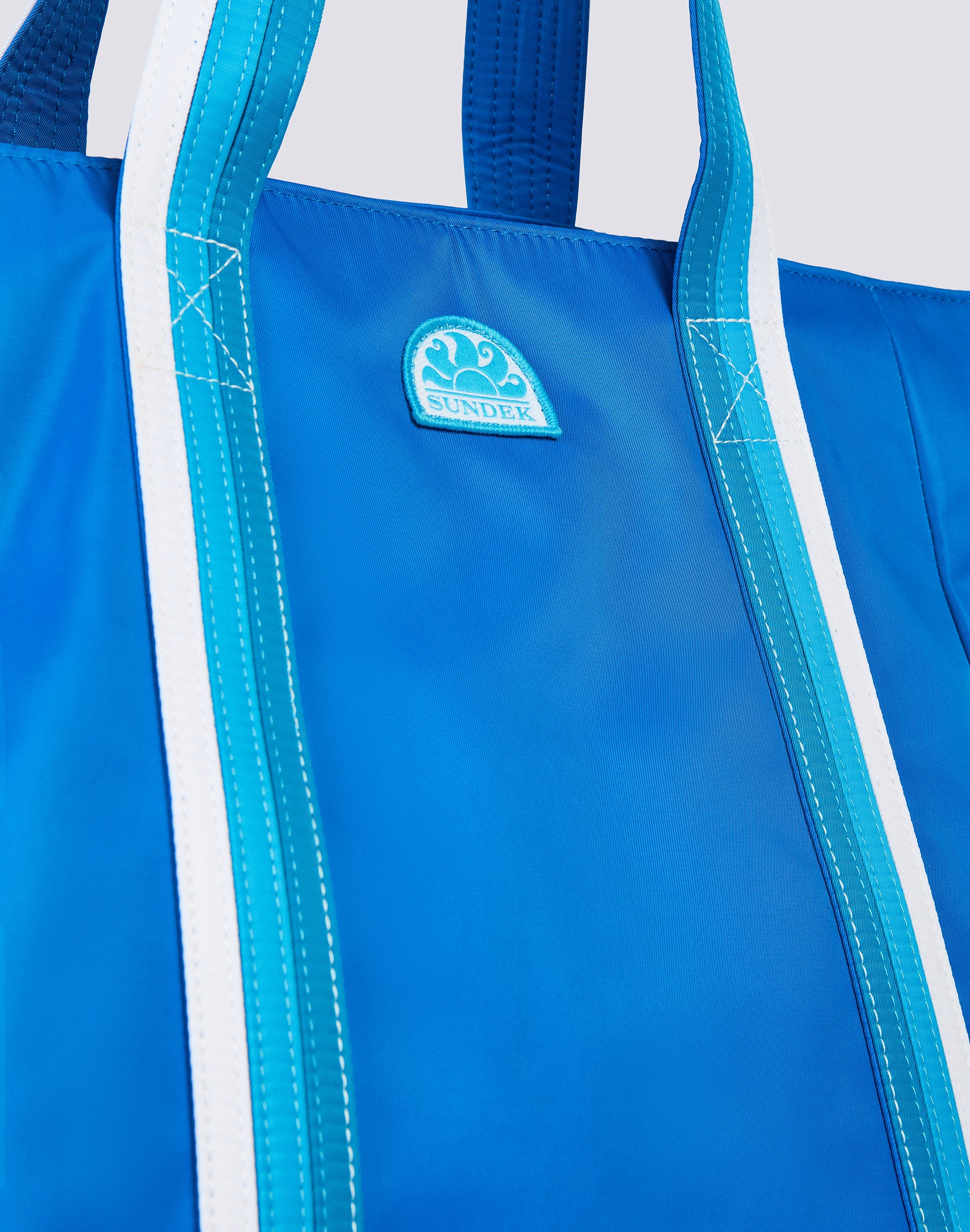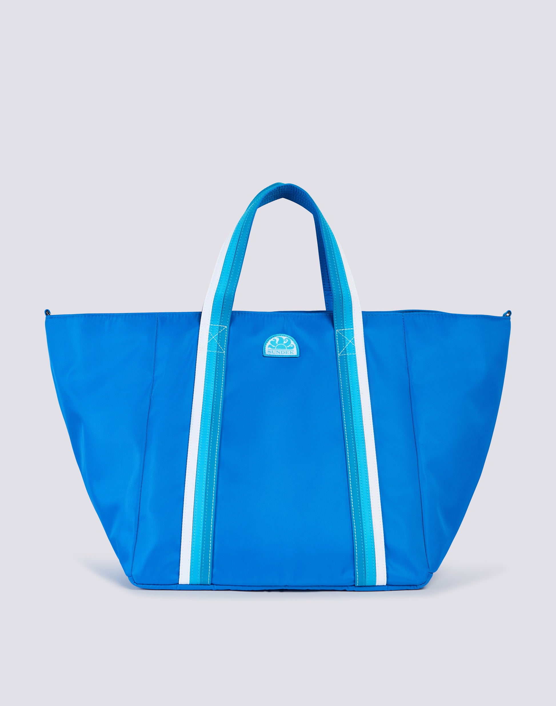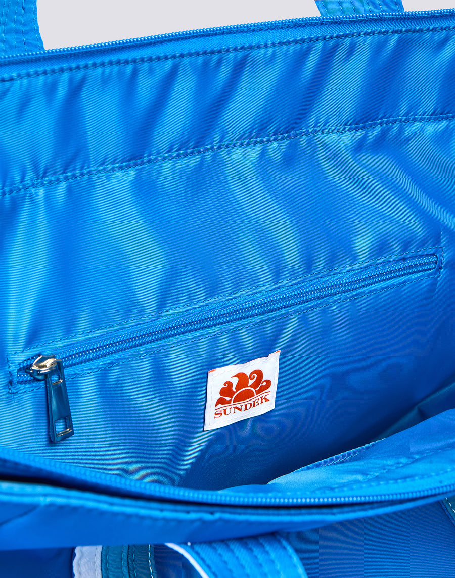 Bolso de playa Alen con asas de colores, cremallera central y bandolera extraíble. Equipado con bolsillos interiores con cremallera, es colorido, alegre, espacioso y perfecto para la playa.