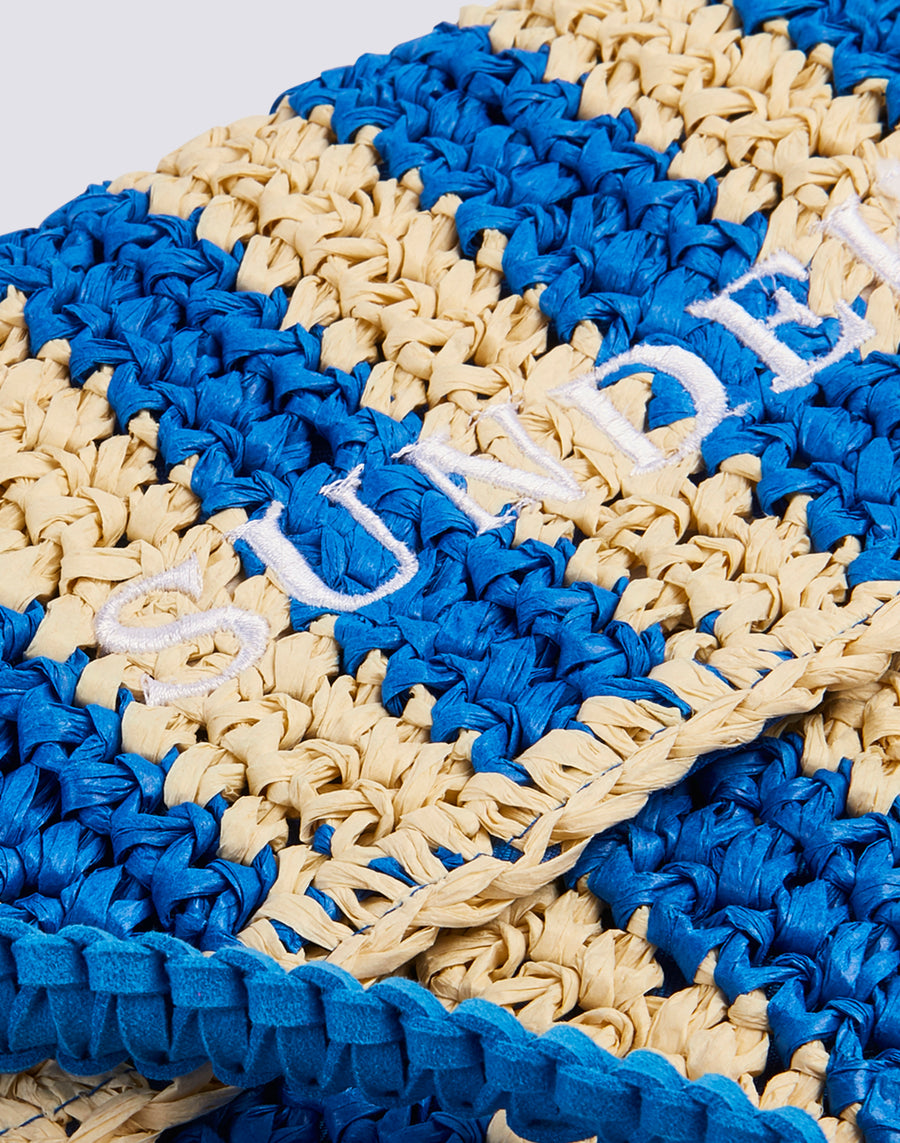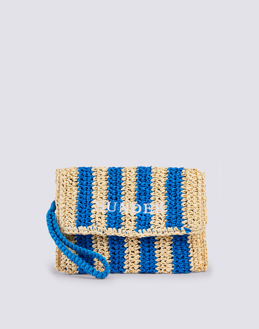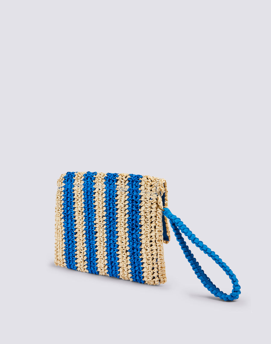 Bolso de mano Izumi de papel efecto paja con estampado de rayas. Equipado con un asa de mano, es cómodo de llevar gracias a su pequeño tamaño. El estampado de rayas lo hace alegre y original.
