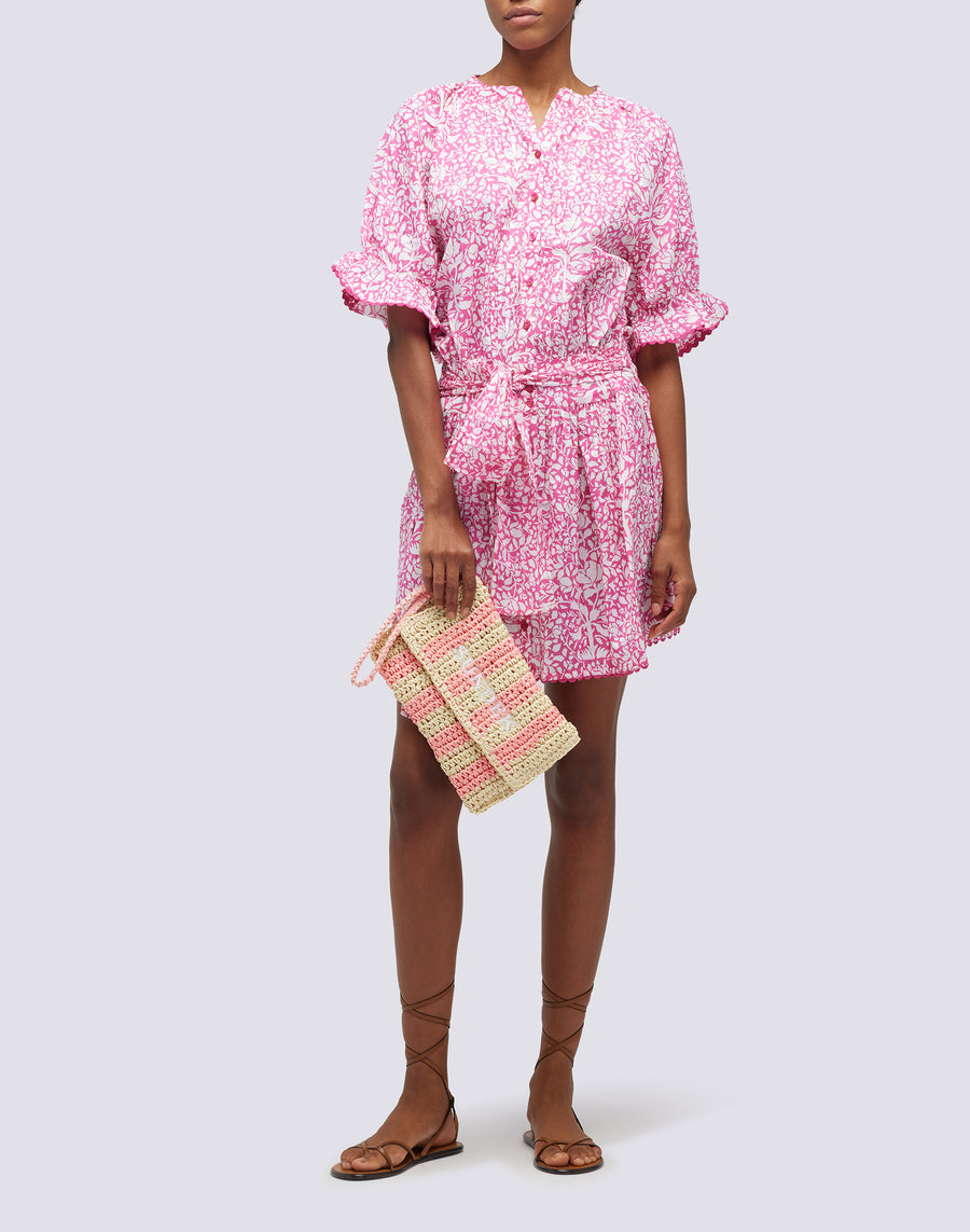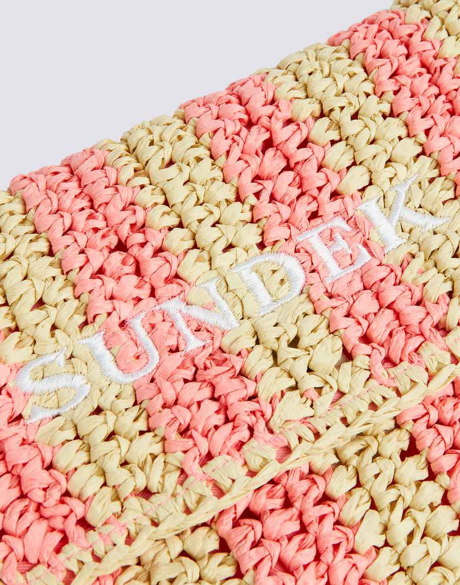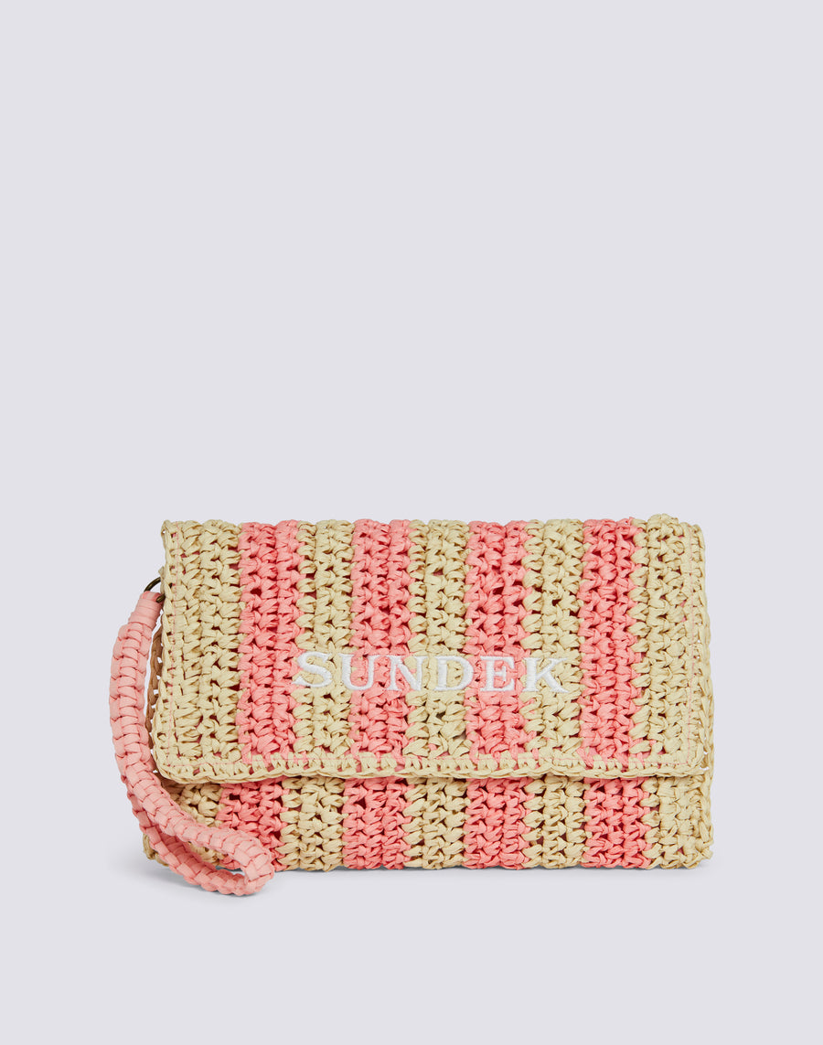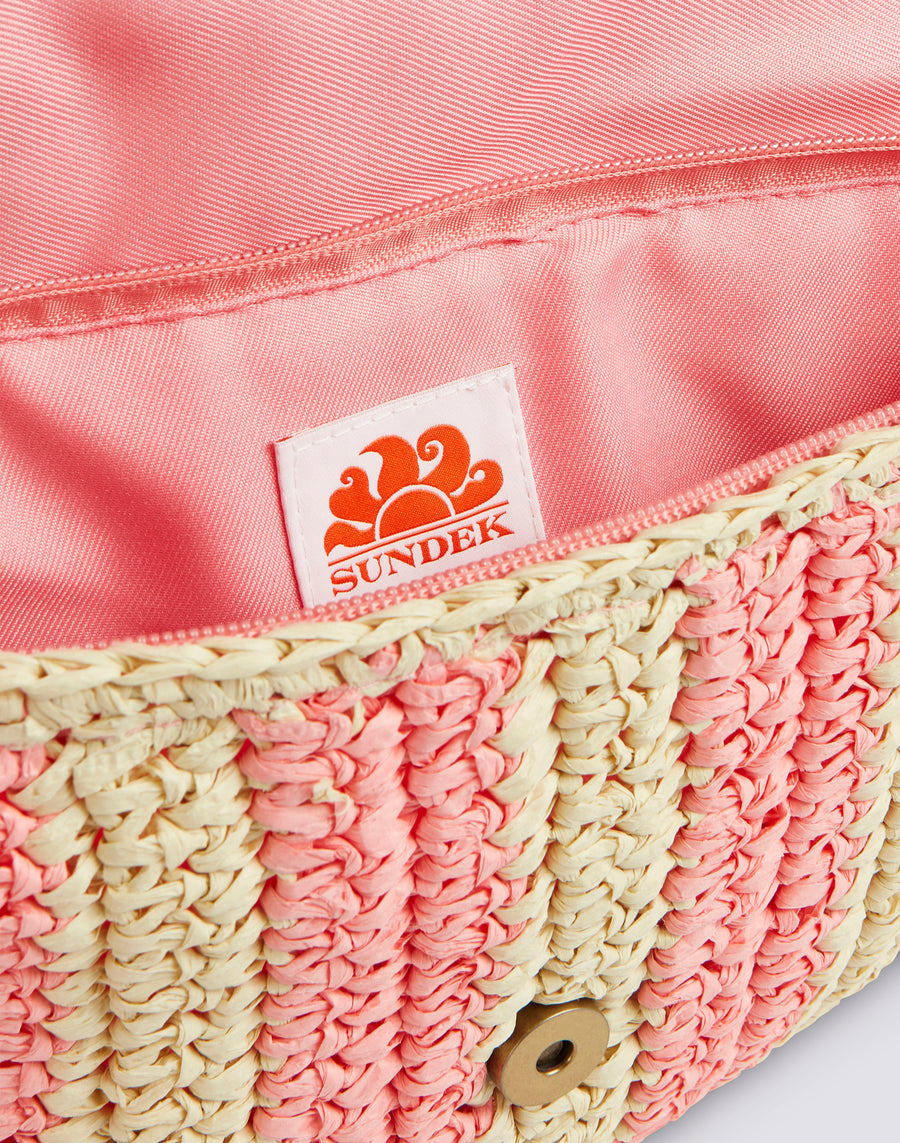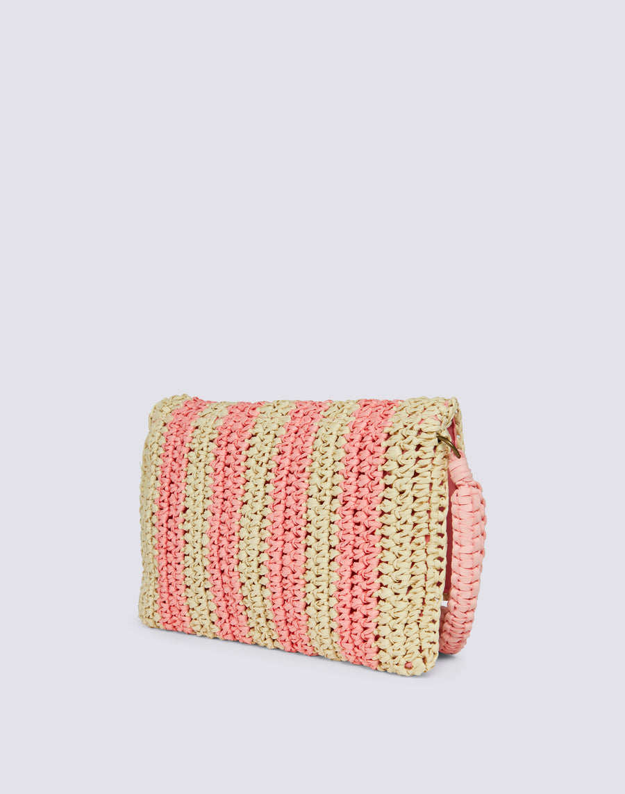 Bolso de mano Izumi de papel efecto paja con estampado de rayas. Equipado con un asa de mano, es cómodo de llevar gracias a su pequeño tamaño. El estampado de rayas lo hace alegre y original.