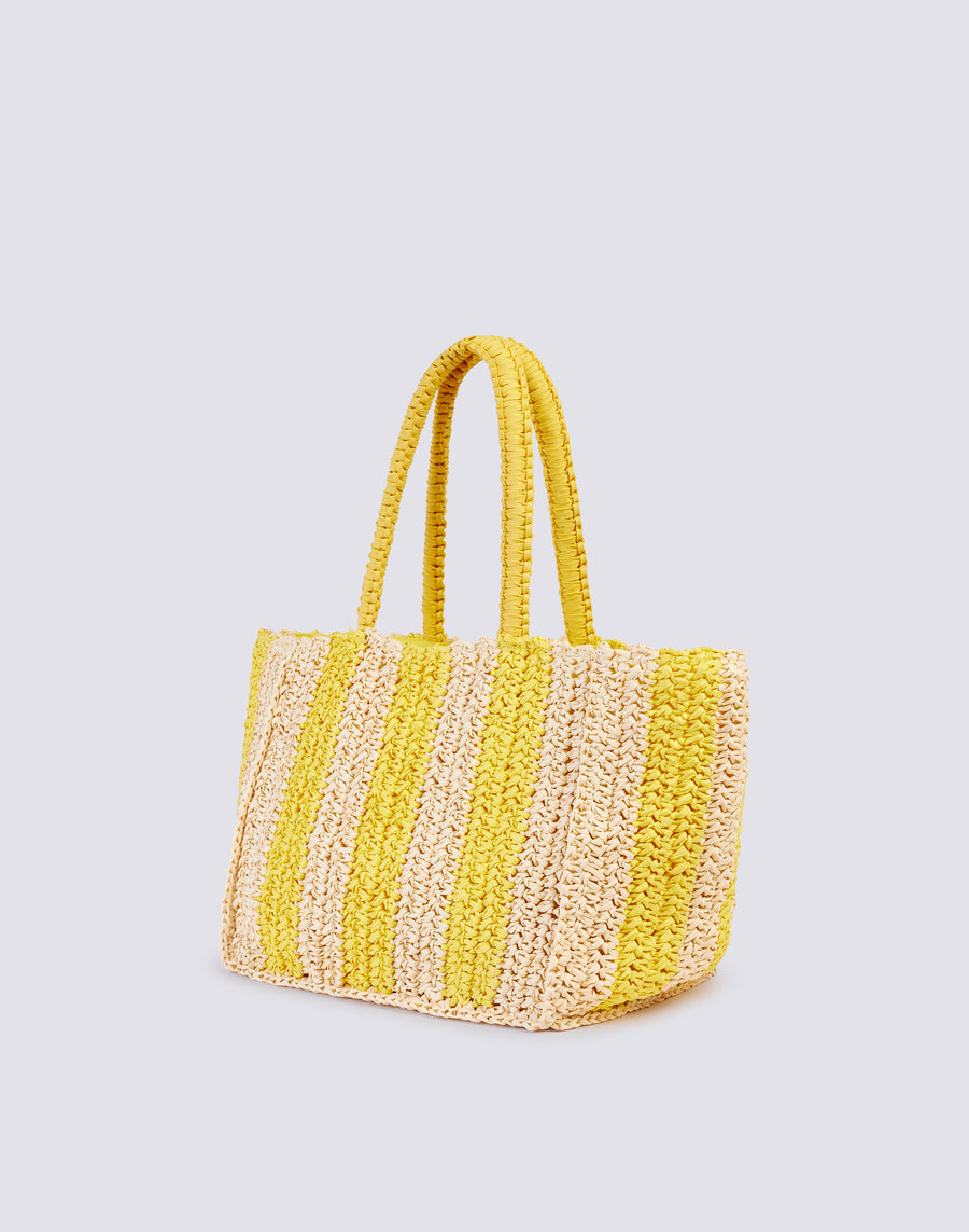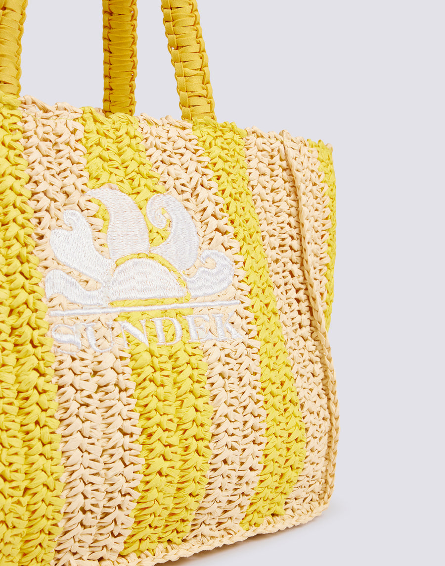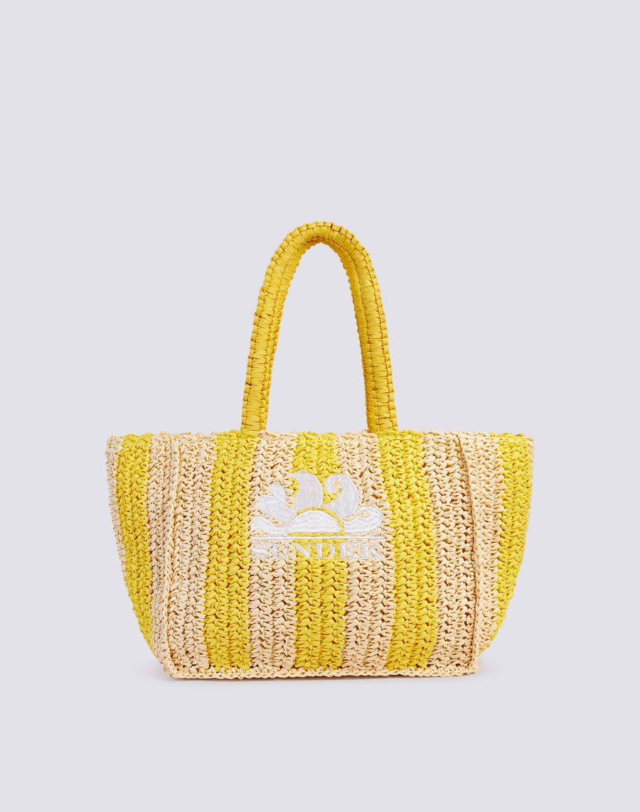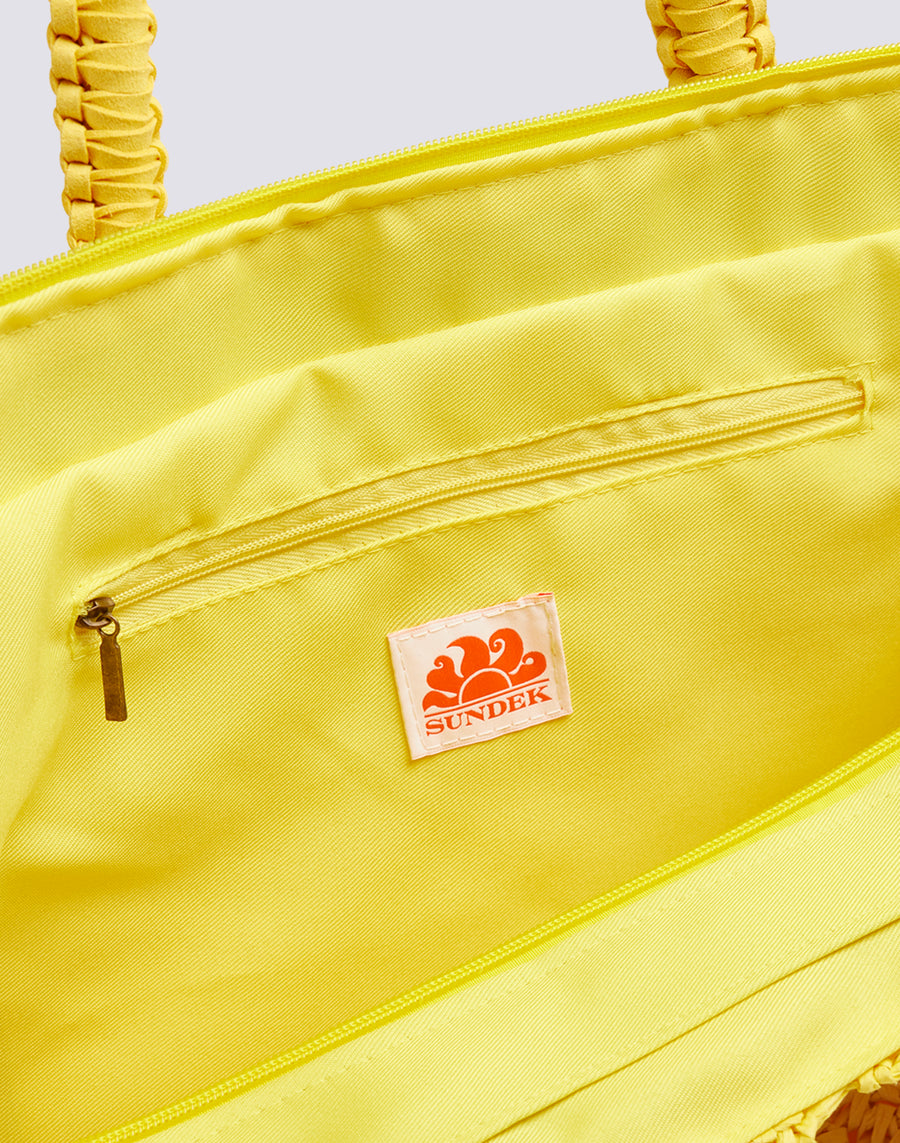 Elegante bolso de paja tejida con logotipo bordado y cierre de cremallera. Equipado con un minibolsillo interior, es perfecto para la playa o para pasear por el centro, para que siempre lleves contigo todo lo que necesitas.