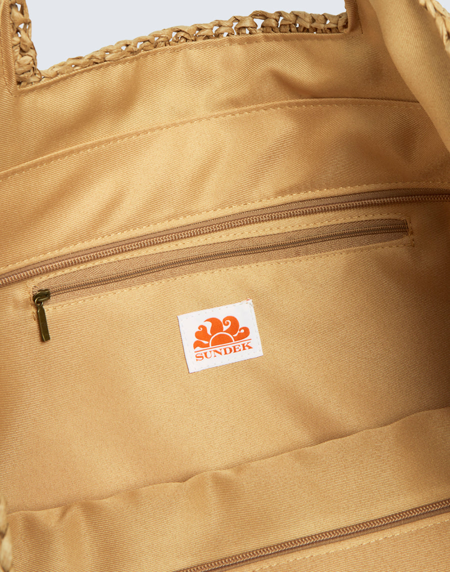 Grande y espaciosa, la bolsa de papel tramado es el accesorio de verano por definición: perfecta para la playa y para cualquier ocasión diaria, también te acompañará de manera desenfadada en la ciudad en combinación con tus outfits de verano informales.