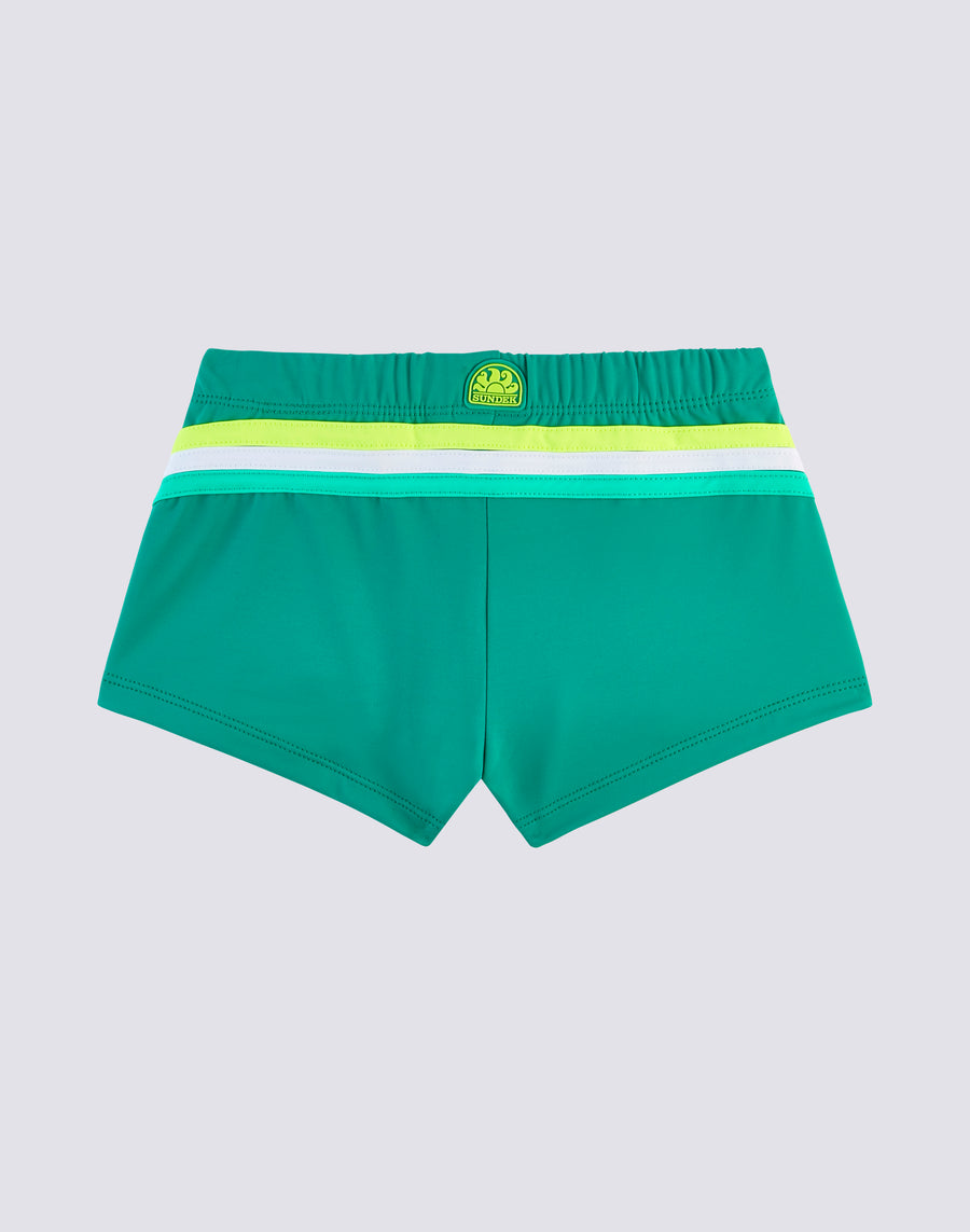 Los calzoncillos de playa para niños son todo color y sin olvidar el medio ambiente, porque están hechos de nailon regenerado ECONYL®. Cómodo gracias a la cintura elástica y al cordón ajustable, es el bañador que tu hijo podrá llevar fácilmente para jugar y nadar.
