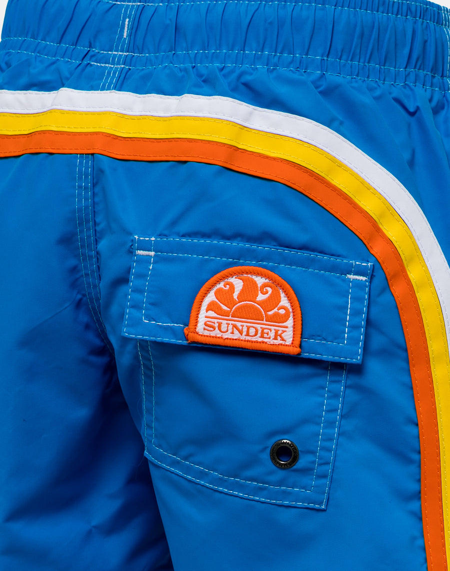 Color intenso y tejido hipercómodo de secado rápido para este short de playa de niño. Un modelo que acompañará a tu hijo en sus mil actividades en vacaciones, perfecto para moverse y jugar con total libertad. Está confeccionado con nuestra tela de tafetán de nailon tradicional y está construido con costuras de tres agujas que lo hacen duradero con el tiempo. Para empacar, año tras año.
