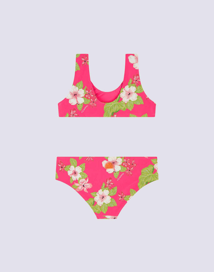 Mini bikini con top deportivo y braguita fija en estampado Dreamy Hawaii para niña. Colorido y súper cómodo.