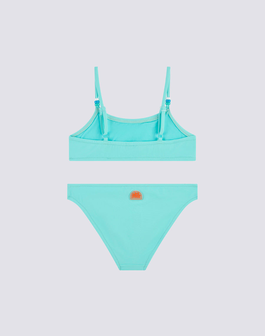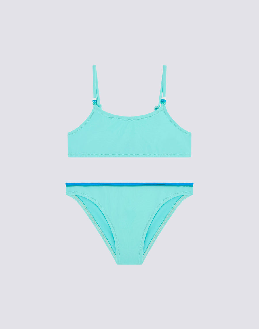 Bikini de playa para niña con parte de arriba ajustable con lazos adornados con abalorios. El color de las cuentas se repite en el detalle tricolor de la braguita del bikini. El traje de baño de dos piezas está confeccionado en tejido VITA by Carvico, cómodo, duradero y resistente al cloro y a los protectores solares.