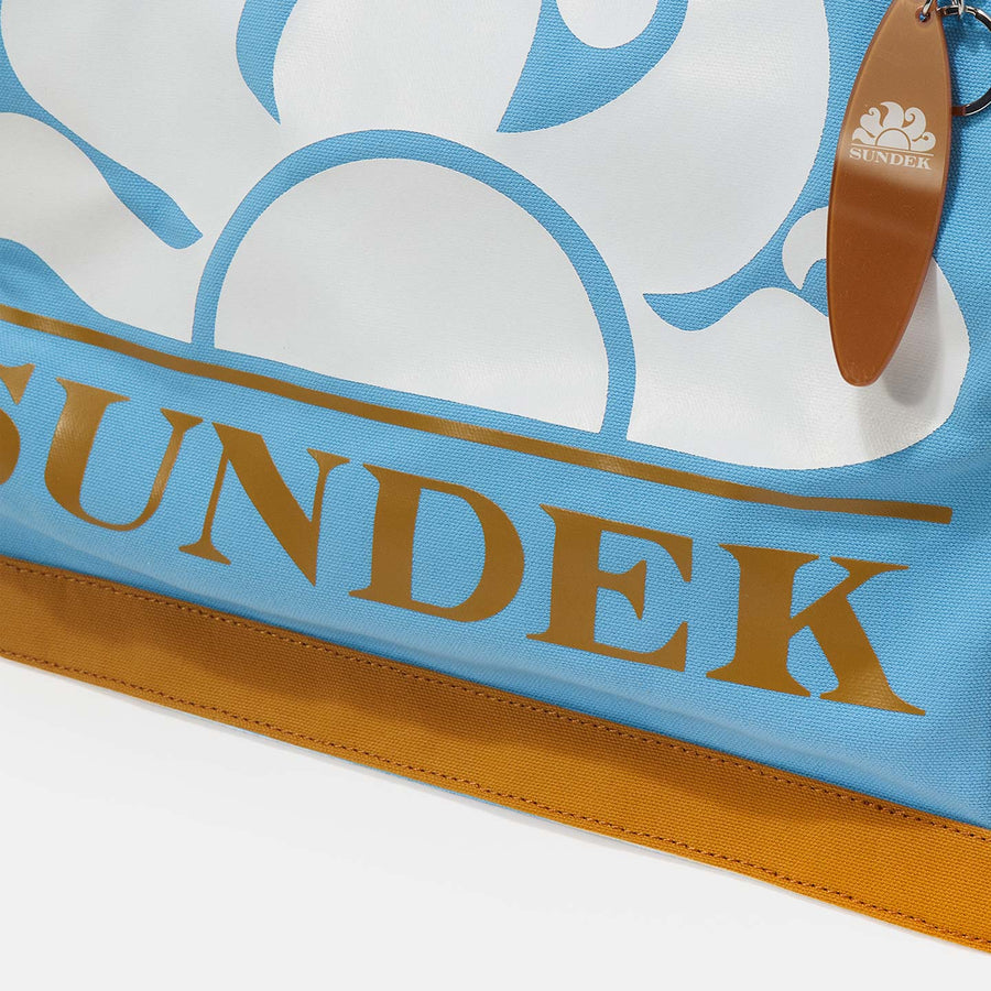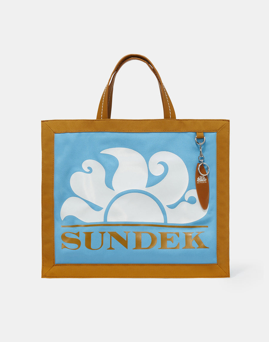 Bolsa de playa de mano de lona con logotipo estampado. Amplia y espaciosa con bolsillo interior y cierre de cremallera. Charm con la forma característica de una tabla de surf
