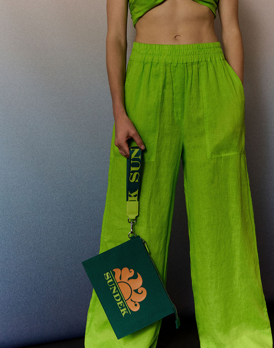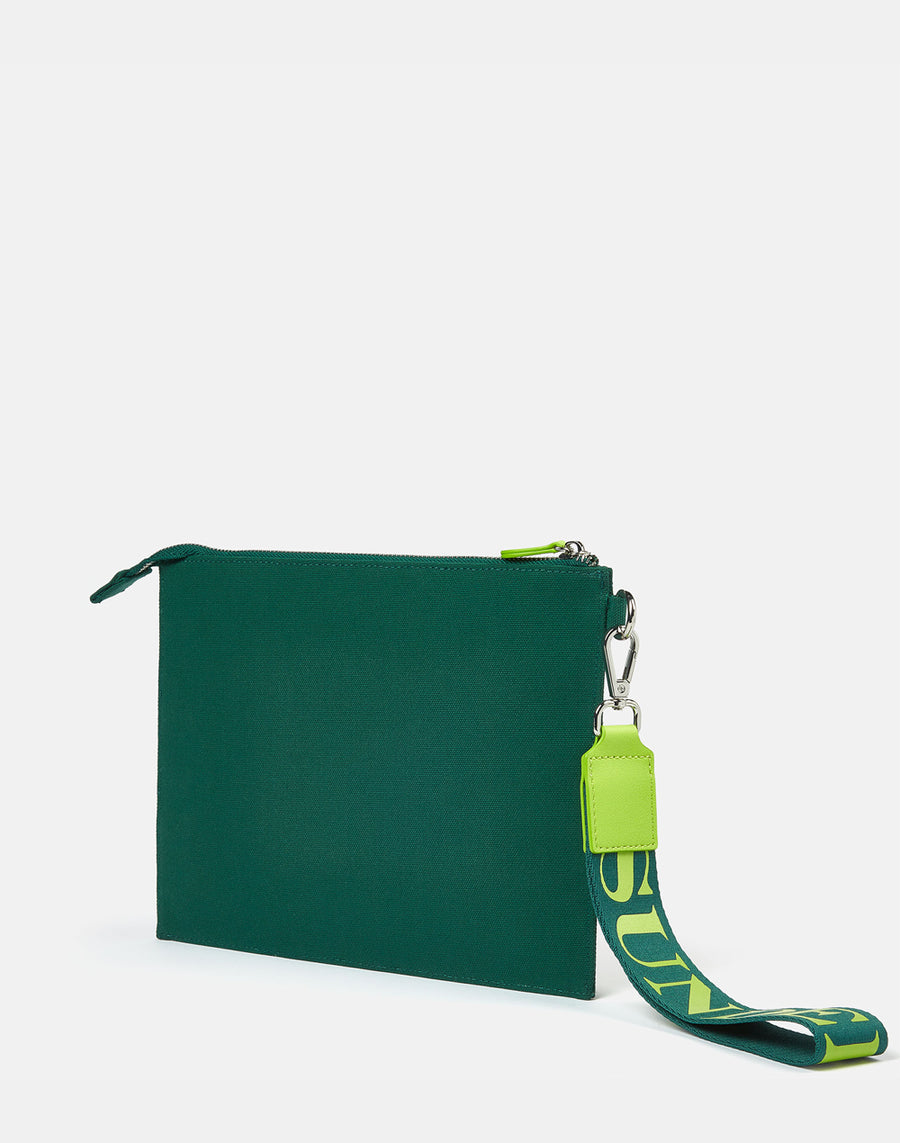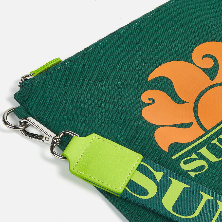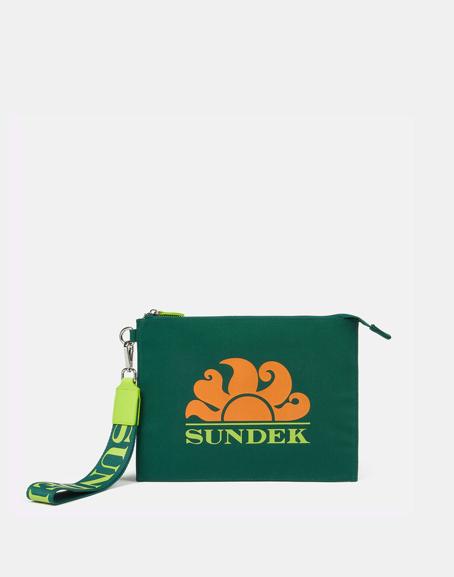 Clutch de lona con logotipo sundek estampado, perfecto tanto como neceser como para llevar como clutch atado a la muñeca. Correa con logotipo extraíble.