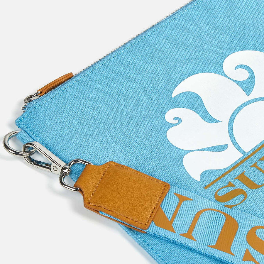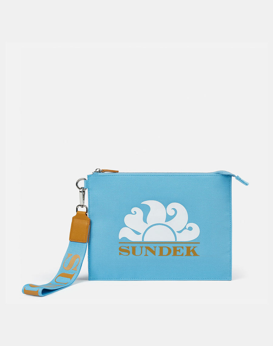 Clutch de lona con logotipo sundek estampado, perfecto tanto como neceser como para llevar como clutch atado a la muñeca. Correa con logotipo extraíble.