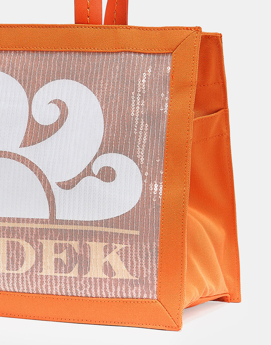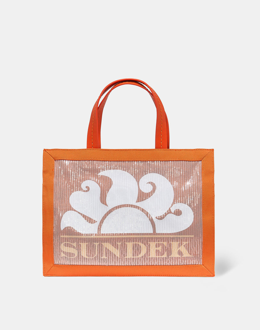 Bolso mediano de malla con detalles de lentejuelas con logotipo Sundek estampado. Esta bolsa es perfecta para la playa gracias a su malla de tejido fino que evita el paso de la arena. Charm de tabla de surf aplicado.