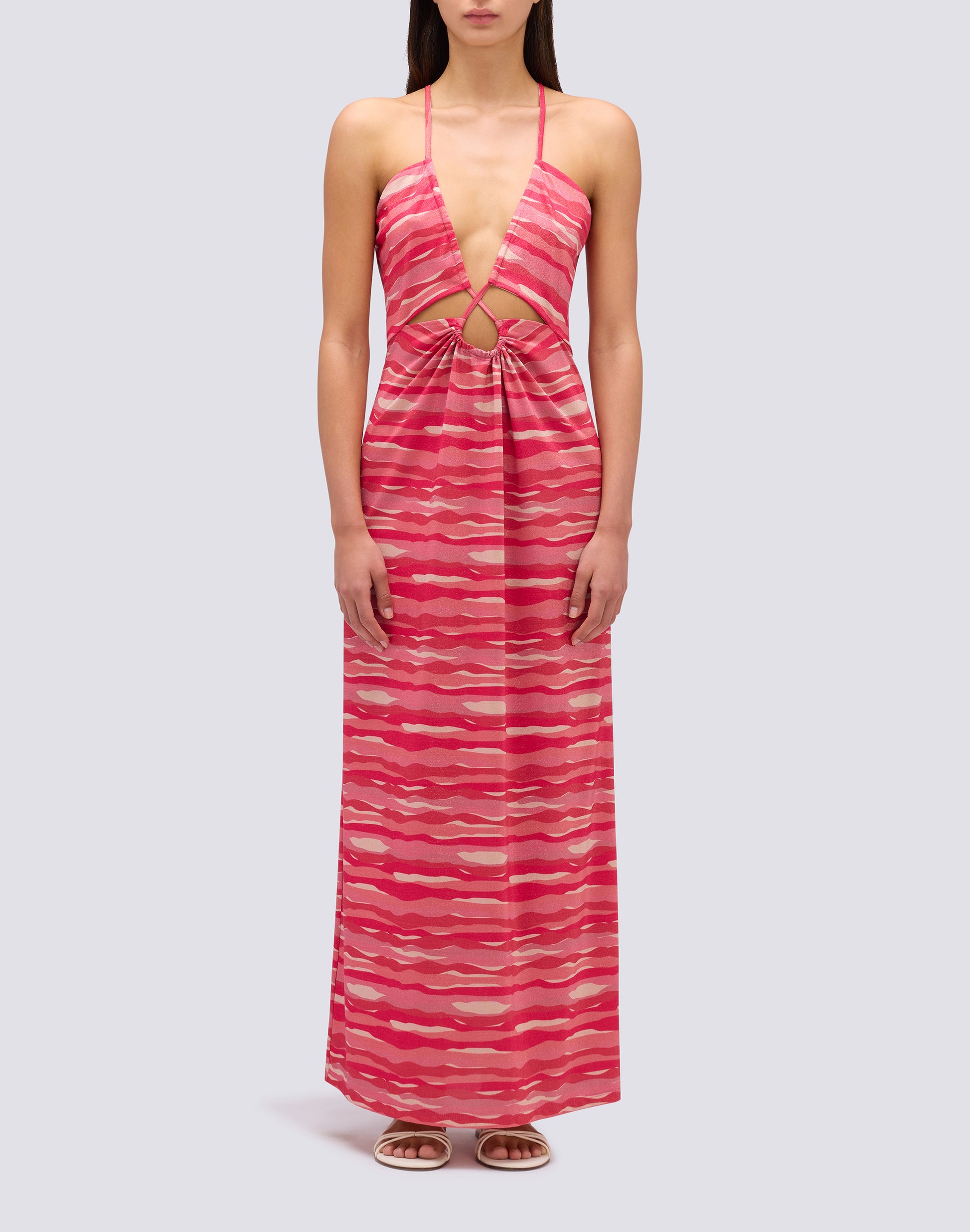 Vestido largo con estampado abstracto de ondas en tejido efecto lúrex. Suave y elegante, cuenta con un lazo ajustable que cruza por detrás del cuello y una confección sin costuras supercómoda.